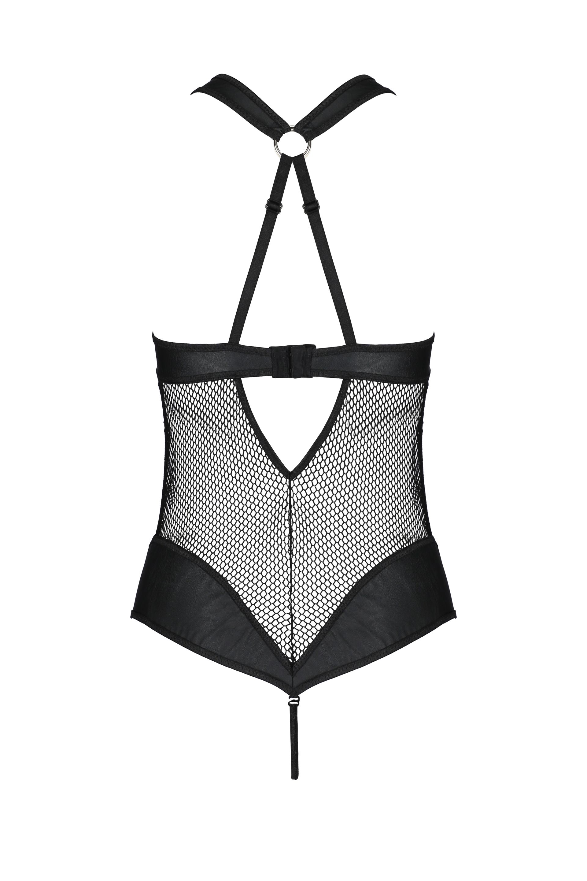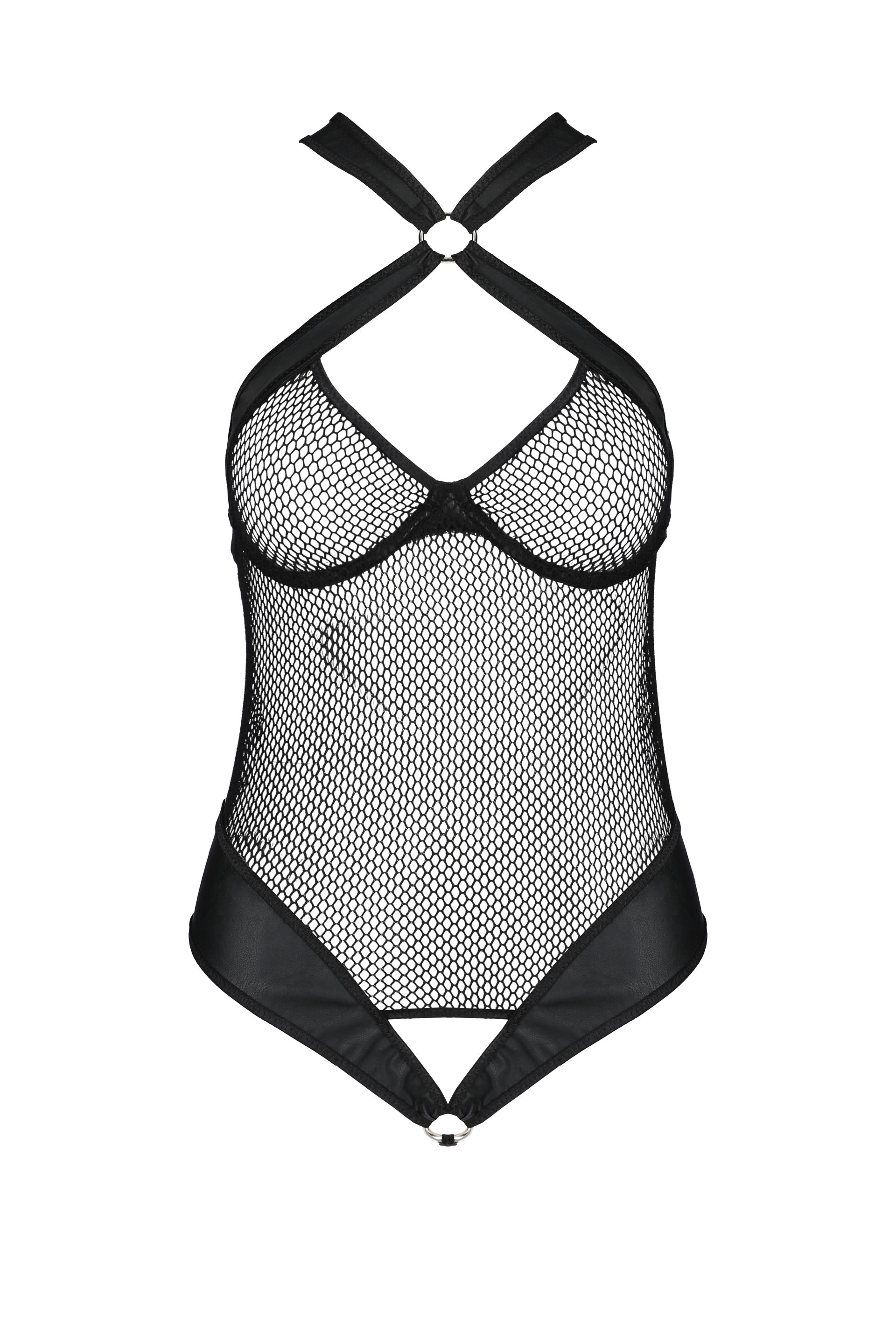 Schwarzer Body aus elastischen Netz und Wetlook-Material. Mit Bügel-Cups, verstellbaren Trägern und einem verstellbaren Rückenverschluss. Am Schritt mit einem Metallring.