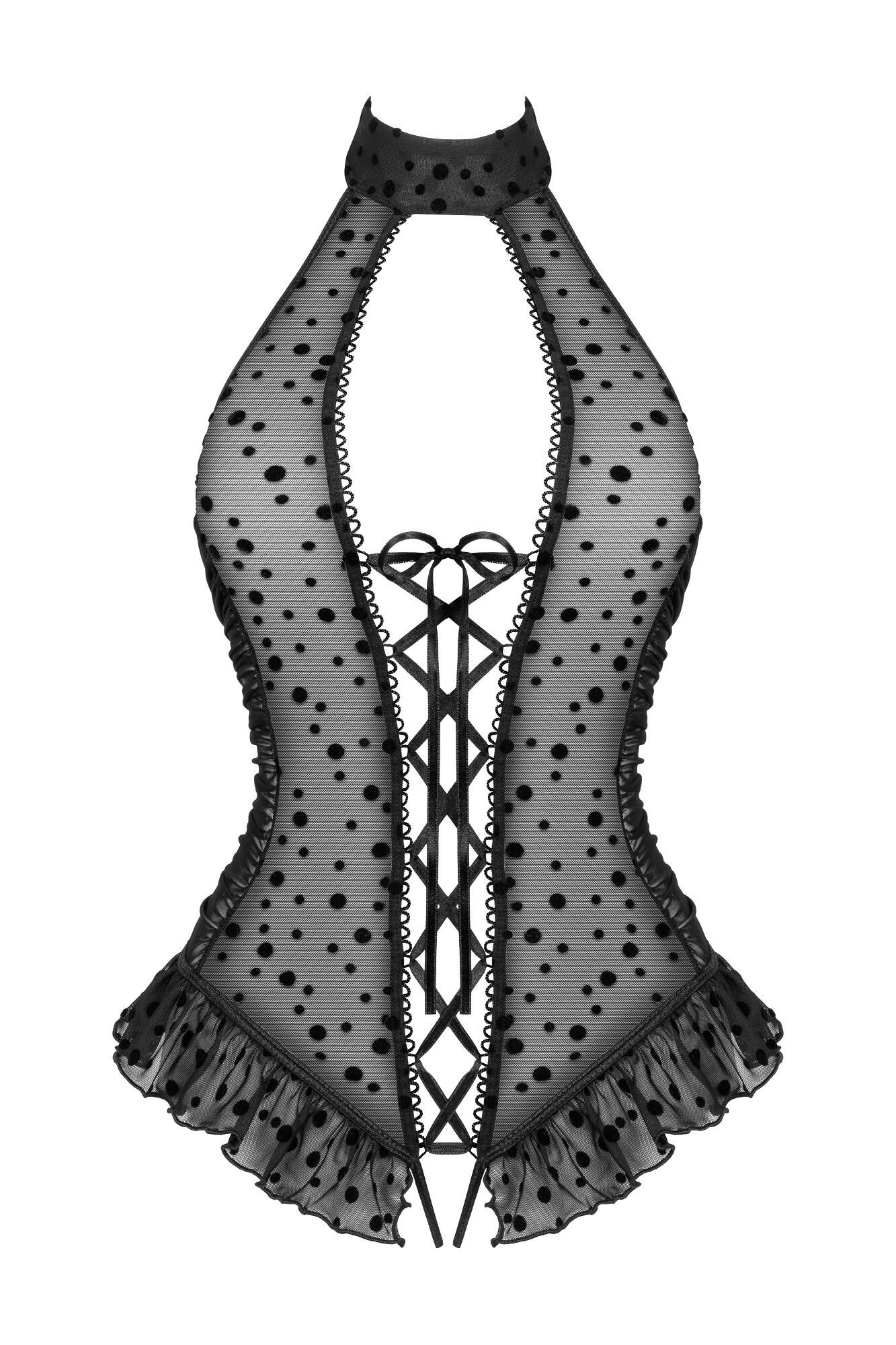 Schwarzer Body mit offenem Schritt. Vorne mit Zier-Schnürung. Aus transparentem Stoff mit Pünktchenmuster.