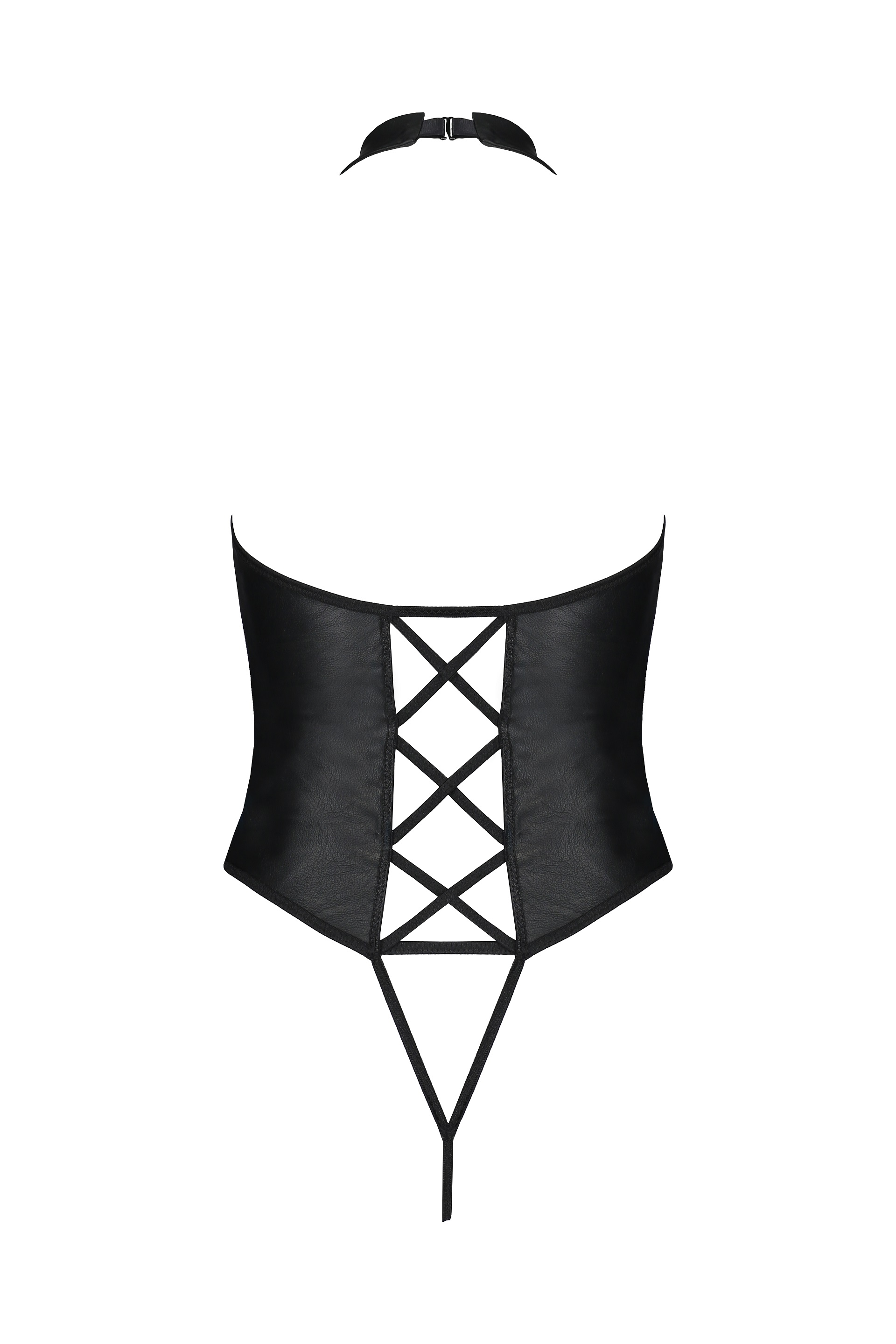 Schwarzer Stringbody aus Wetlook-Material. Mit Neckholder-Verschluss. Vorne und hinten mit überkreuz verlaufenden Riemen.