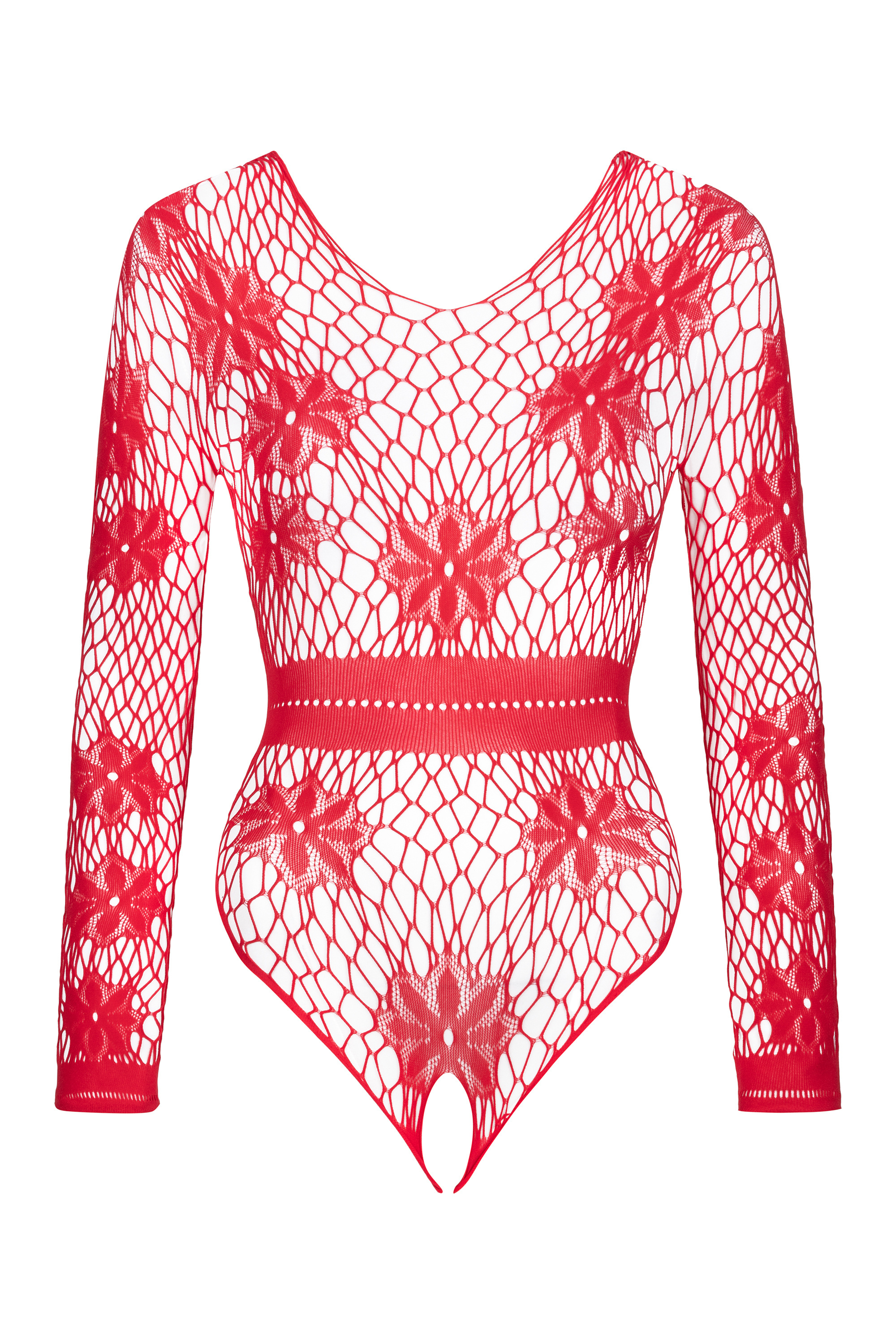 Roter Langarm-Stringbody aus grobmaschigem Netz mit offenem Schritt (ouvert). Hochbeinig zugeschnitten und mit Blumenmotiven verziert.
