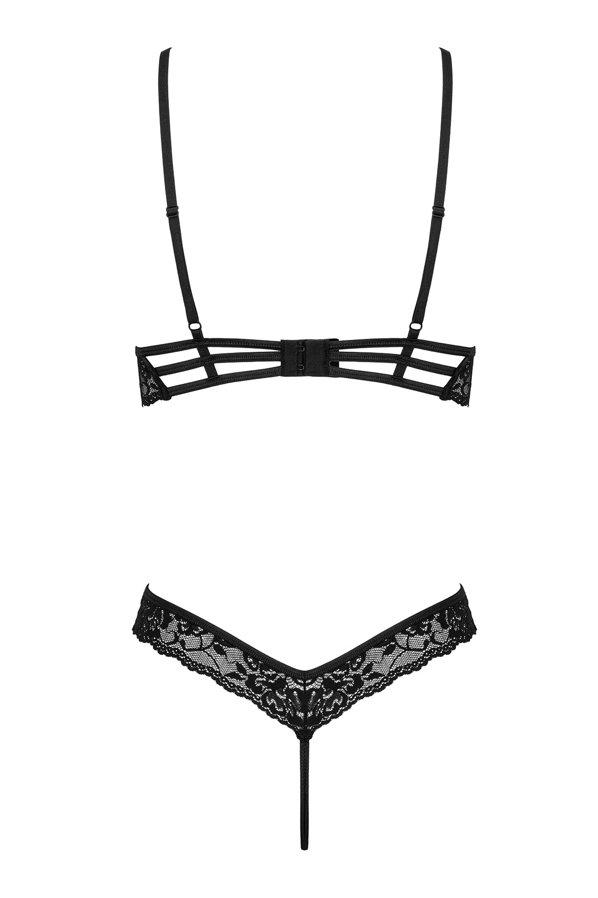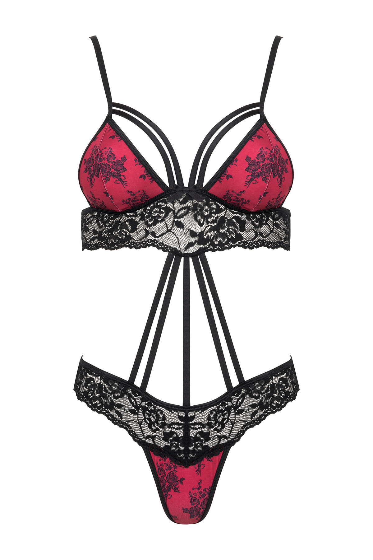 Schwarz-roter Stringbody mit verstellbaren Trägern und einem verstellbaren Rückenverschluss. An den Cups aus Satinstoff mit Blumenmuster. Im Schritt geschlossen. Verfügbare Größen: S/M, L/XL