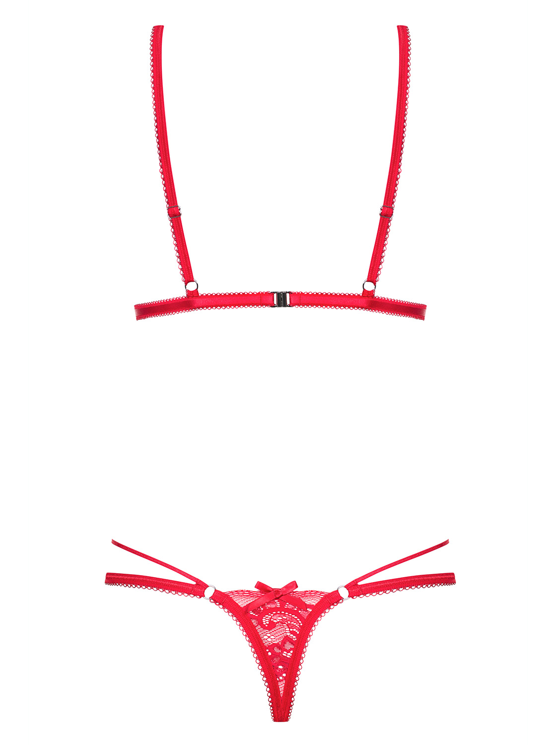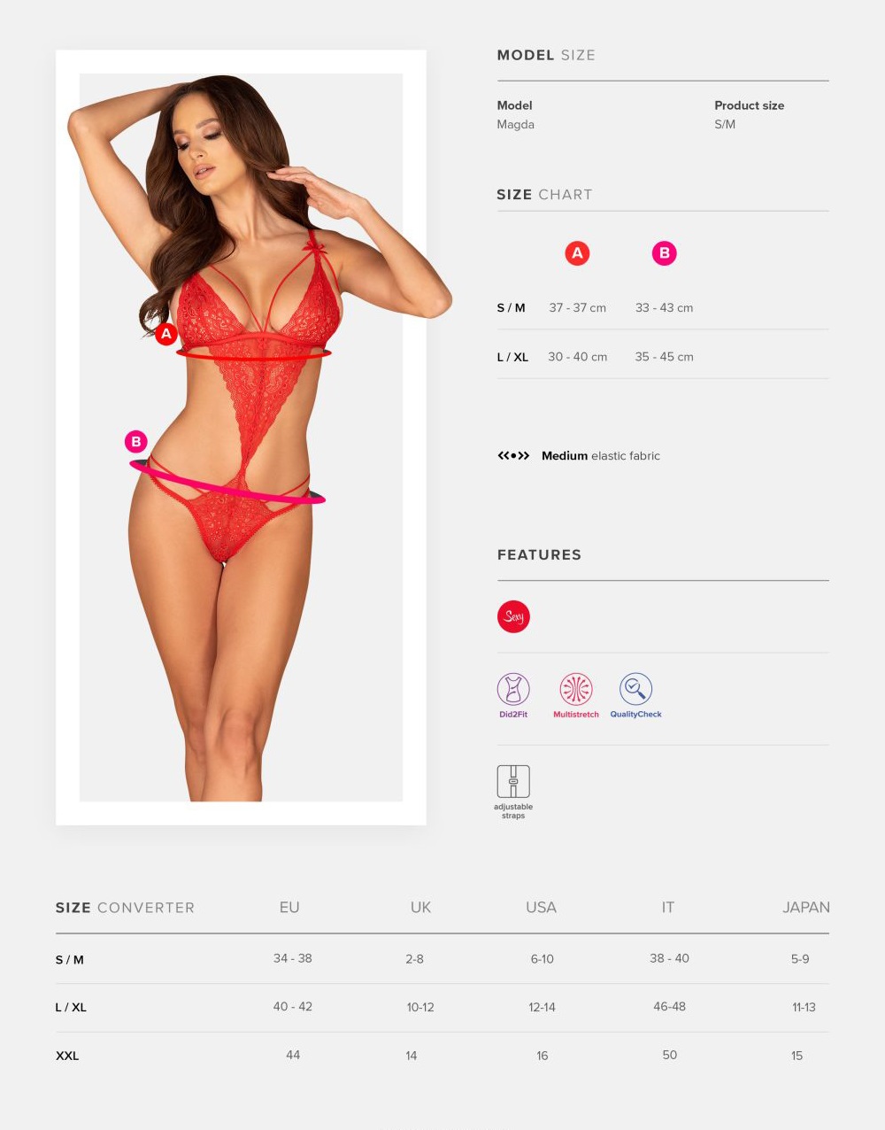 Roter Spitzenbody mit verstellbaren Trägern und Rückenverschluss. Aus leicht transparentem Stretch-Material. Verfügbare Größen: S/M, L/XL