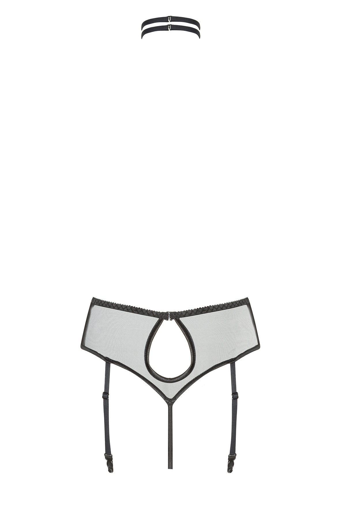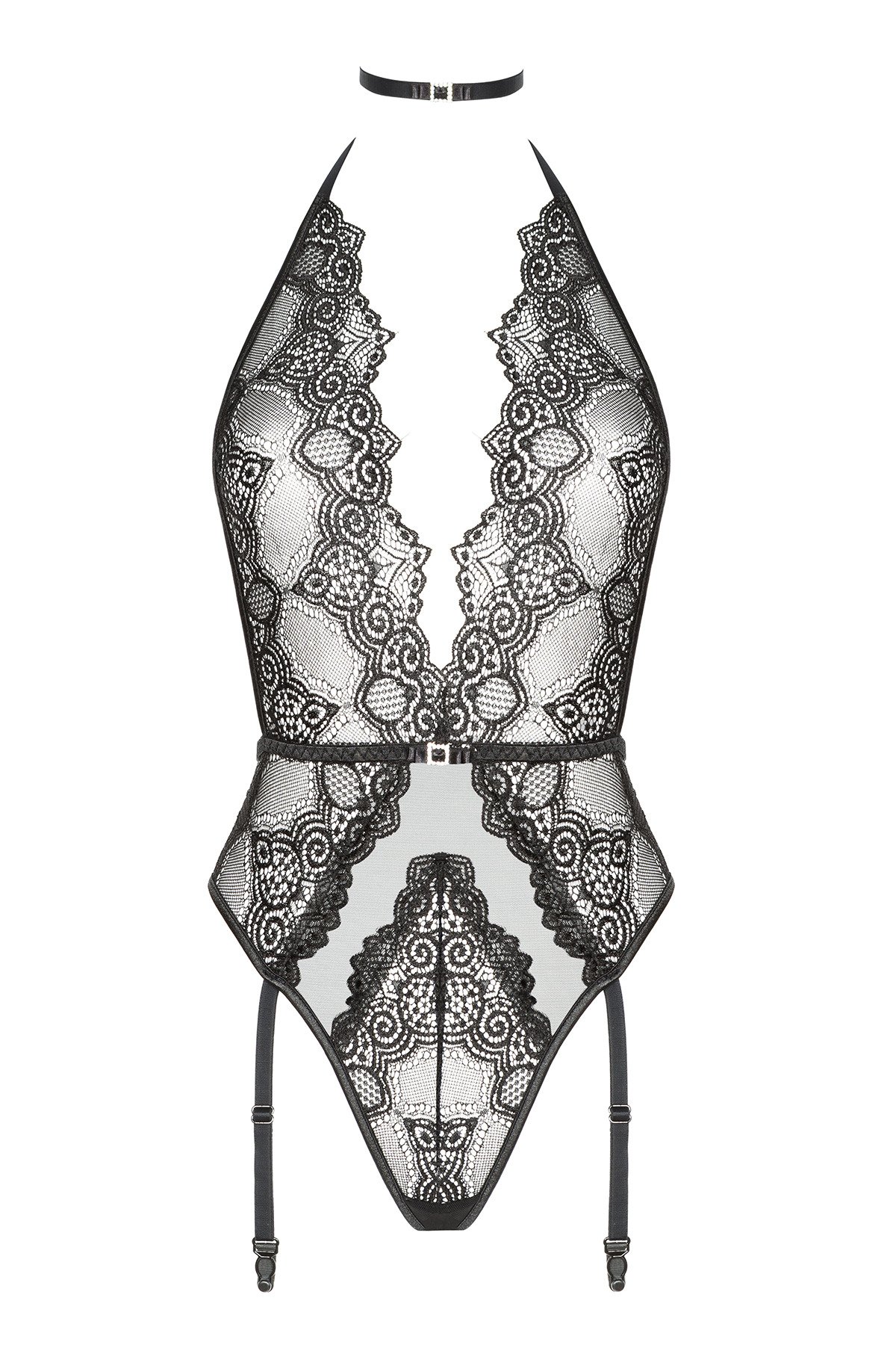 Straps-Body Adelaide in schwarz. Rückenfreier Stringbody, am Nacken verstellbar mit einem Clipverschluss. Mit Spitze und transparentem Tüll verziert. Hochbeinig zugeschnitten und mit verstellbaren Strapshaltern. Inkl. Choker (Halsband) Verfügbare Größen: S/M, L/XL