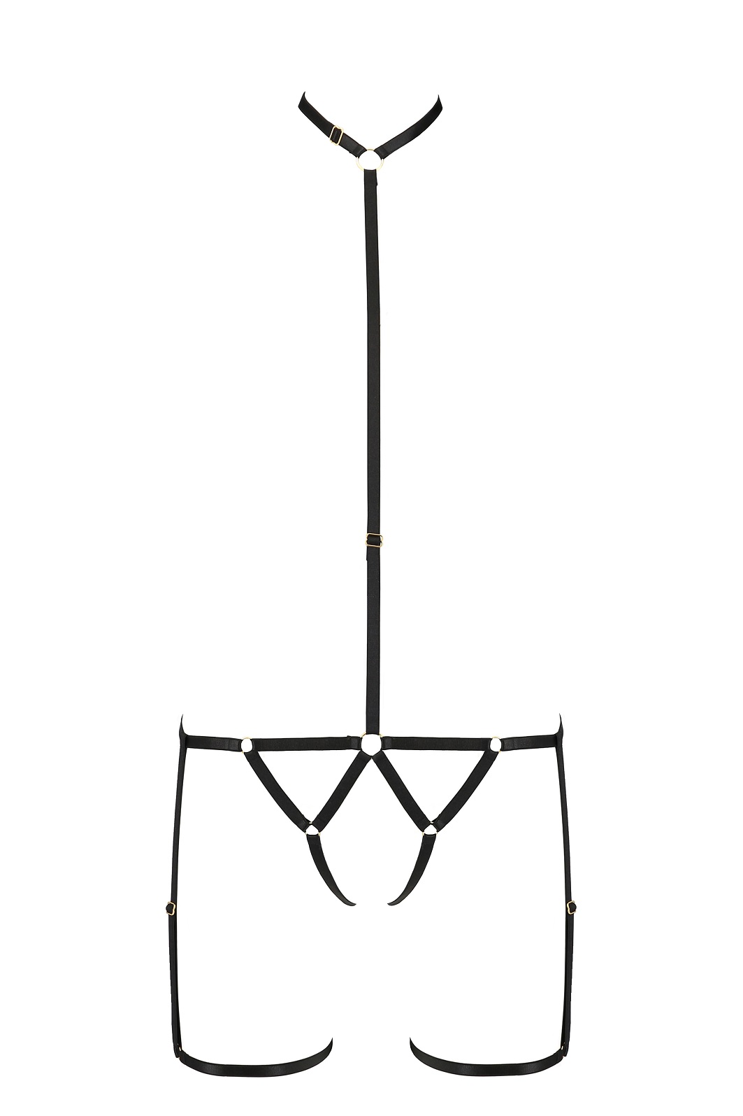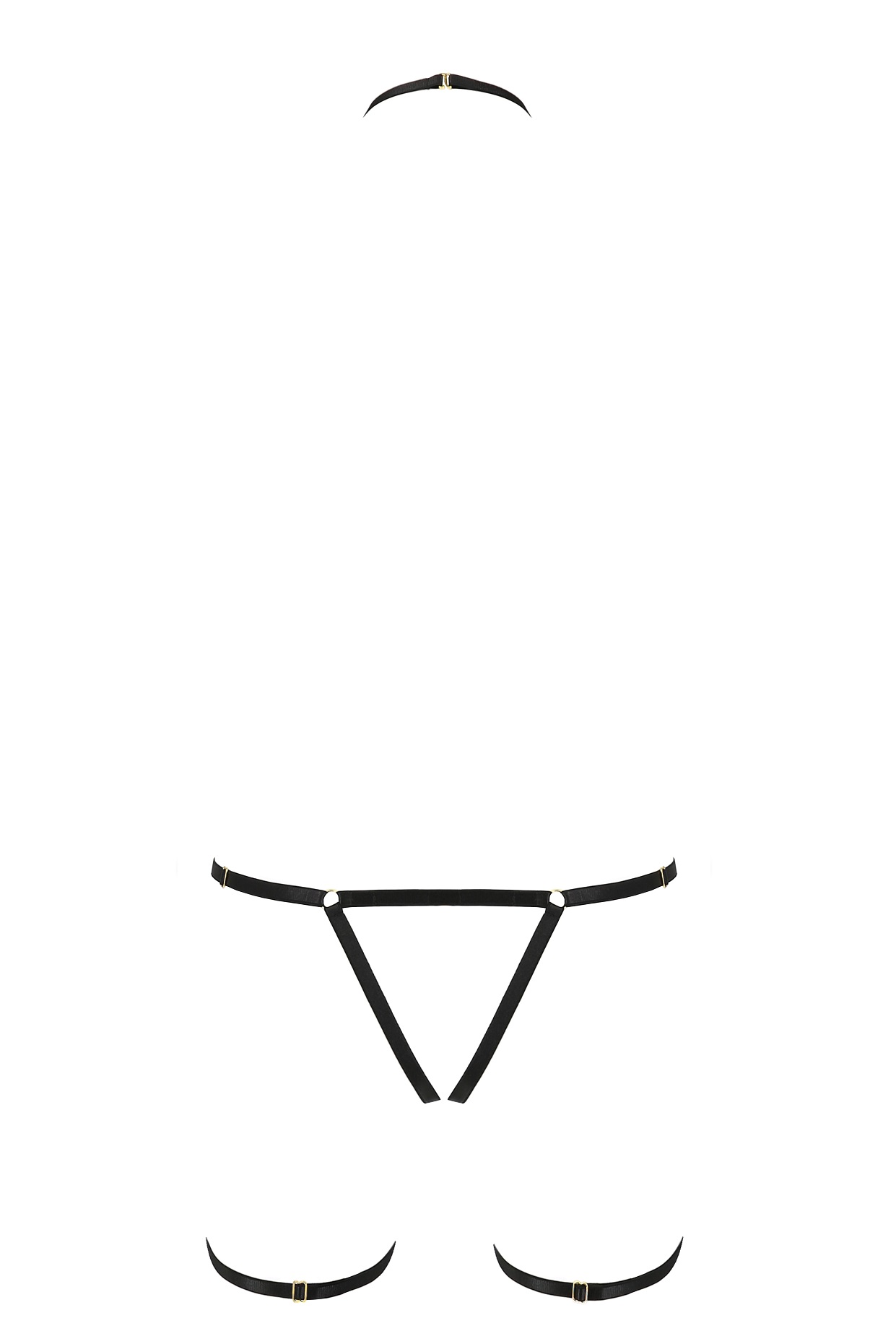 Neckholder-Body aus schwarzen, elastischen Bändern, die individuell einstellbar sind. Pofrei und ouvert. Mit goldenen Schnallen und Ringen.