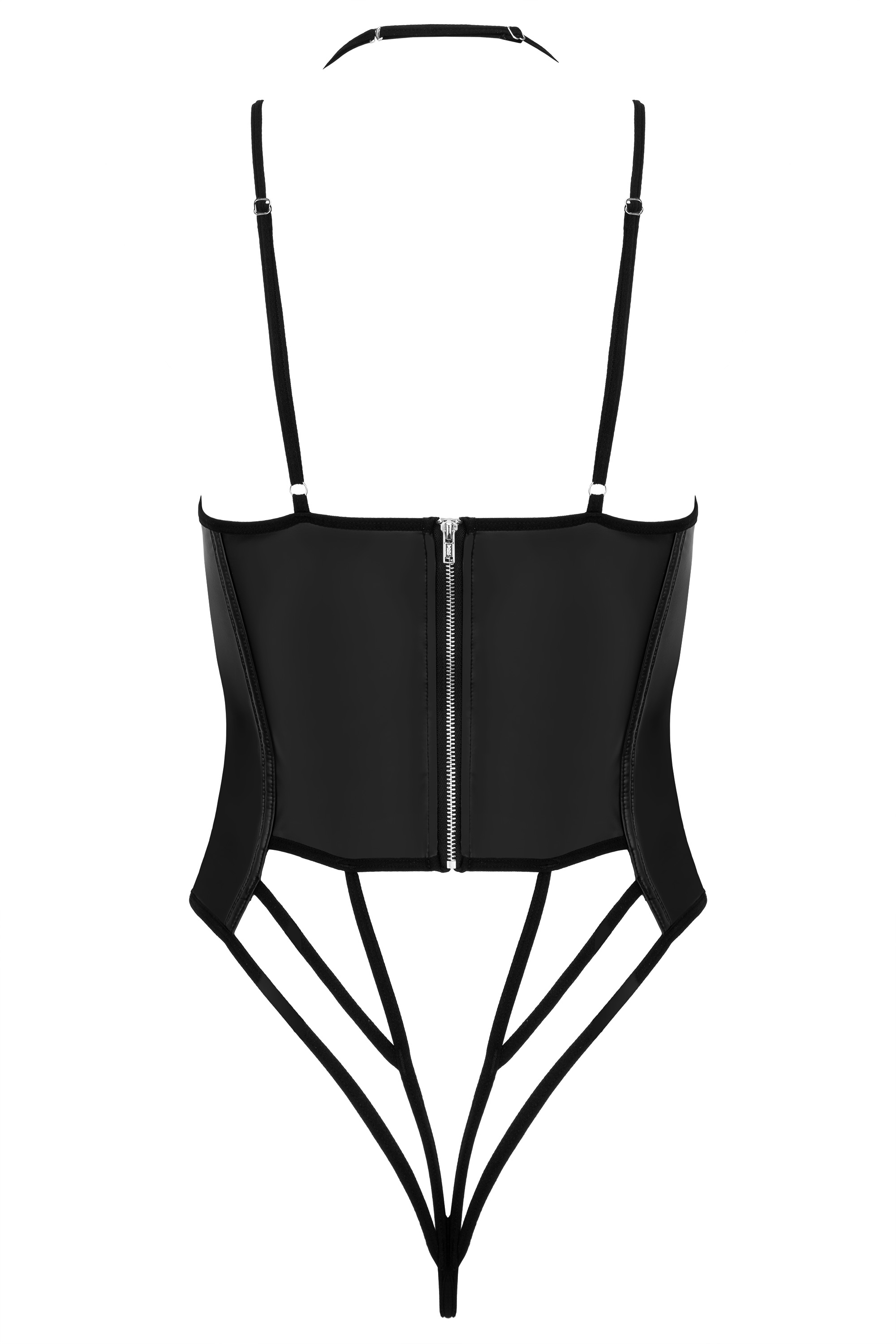 Schwarzer Body im Wetlook mit Reißverschluss hinten. Mit Bügel-Cups und verstellbaren Trägern. Am Gesäß mit elastischen Riemchen.