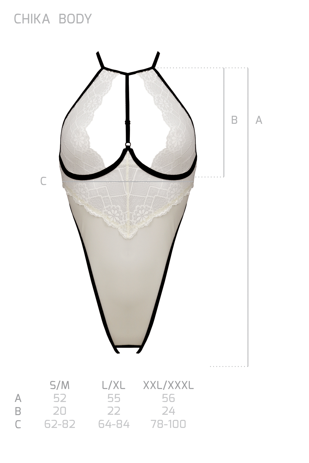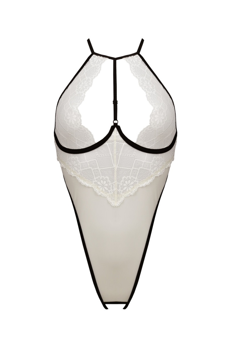 Offener Body aus beigefarbenem Tüll und Spitze. Die Cups sind mit Bügeln unterlegt. Mehrfach verstellbar und hochbeinig zugeschnitten.