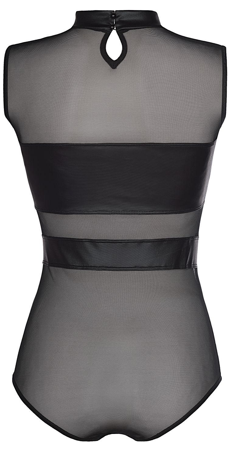 Schwarzer Body aus transparentem Tüll. Mit zwei blickdichten latexähnlichen Streifen. Der Body ist elastisch und angenehmen zu tragen. Im Schritt geschlossen, mit Baumwollzwickel. Verfügbare Größen: S, M, L, XL