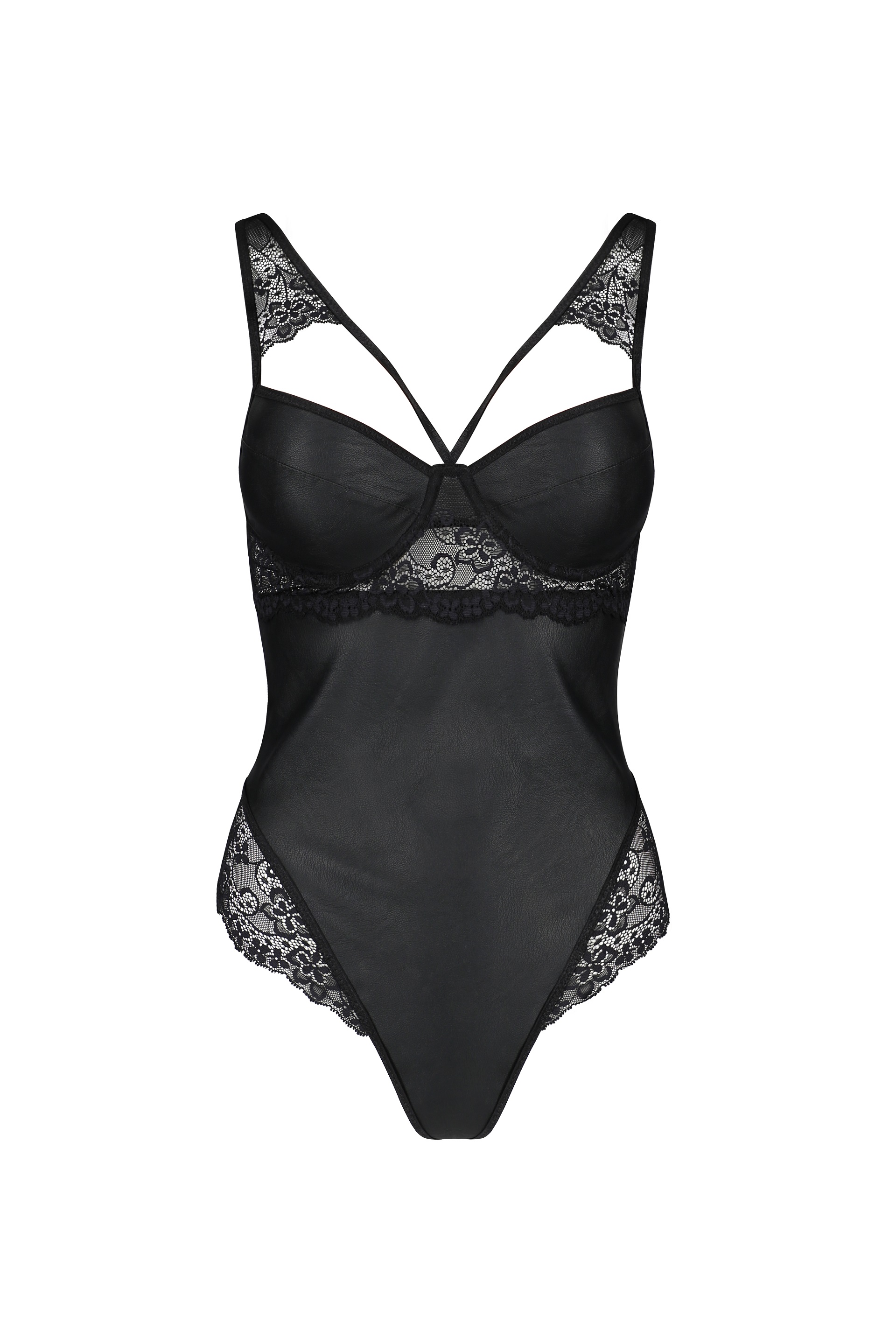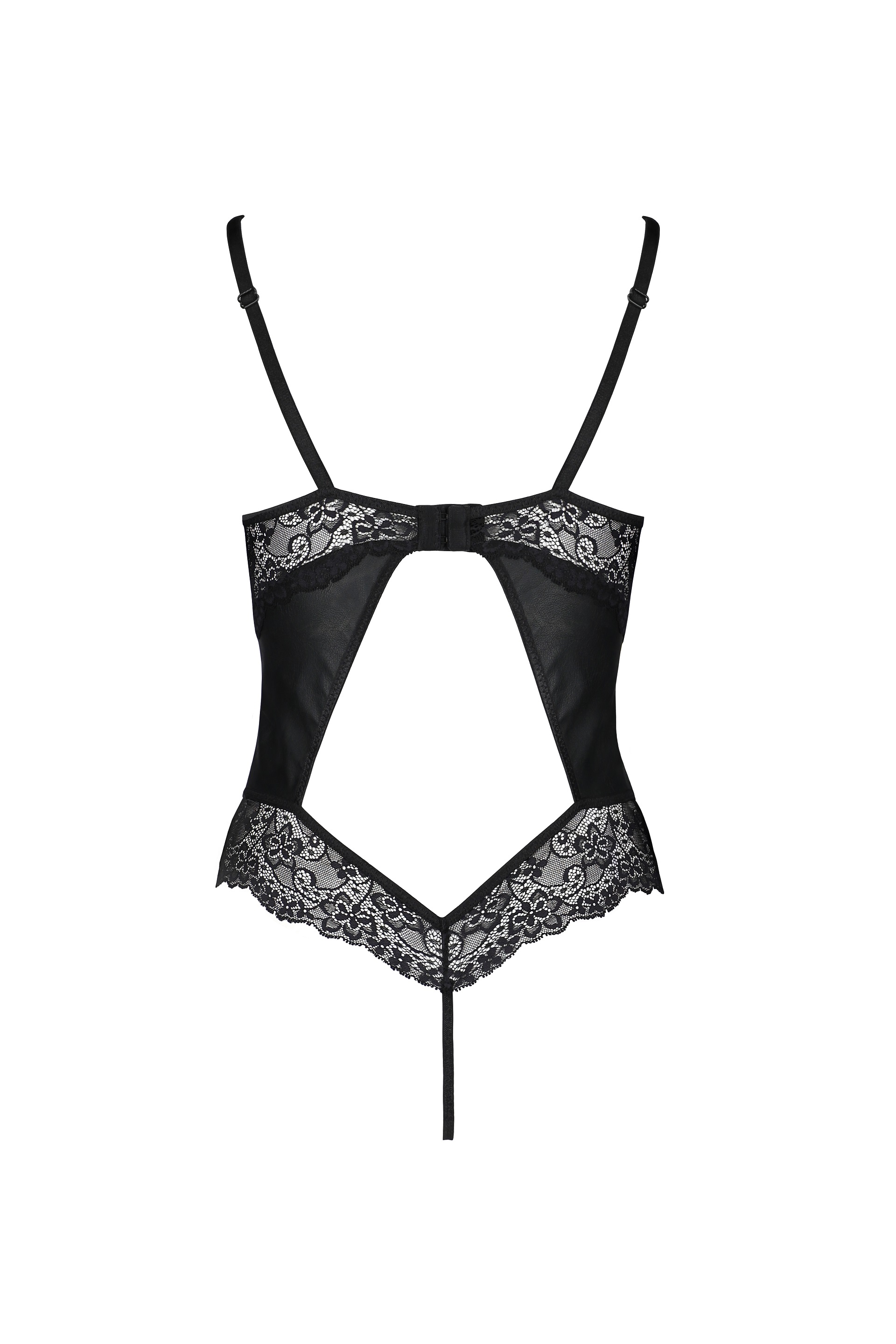 Schwarzer Stringbody aus Wetlook-Material mit Spitzenverzierungen. Mit verstellbaren Trägern und Bügel-Cups. Über dem Rückenausschnitt mit einem verstellbaren Hakenverschluss. Verfügbare Größen: S/M, L/XL, XXL/3XL