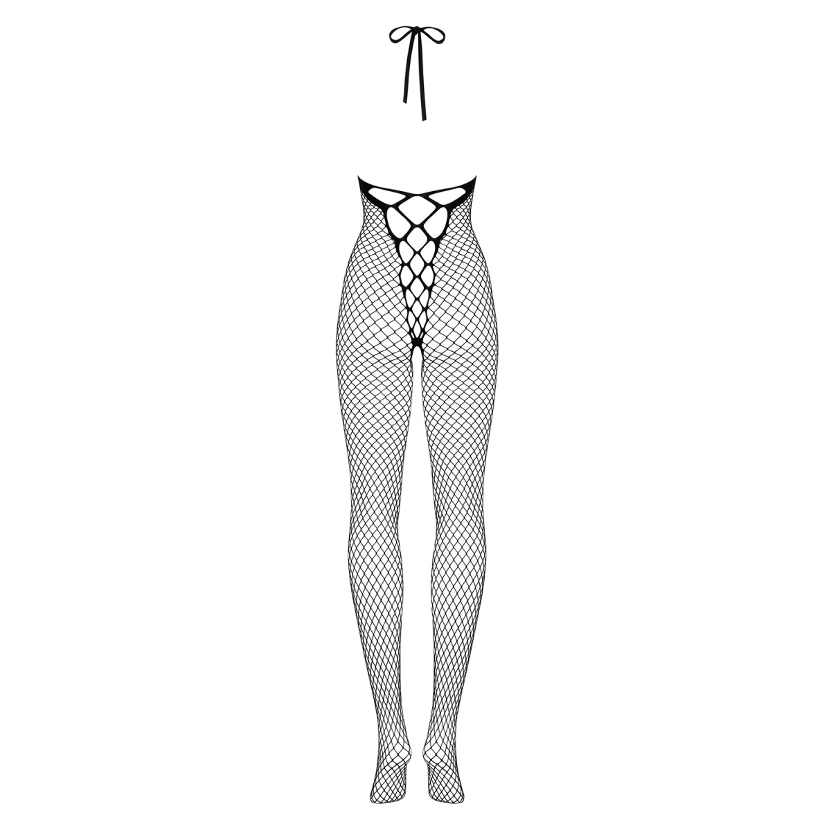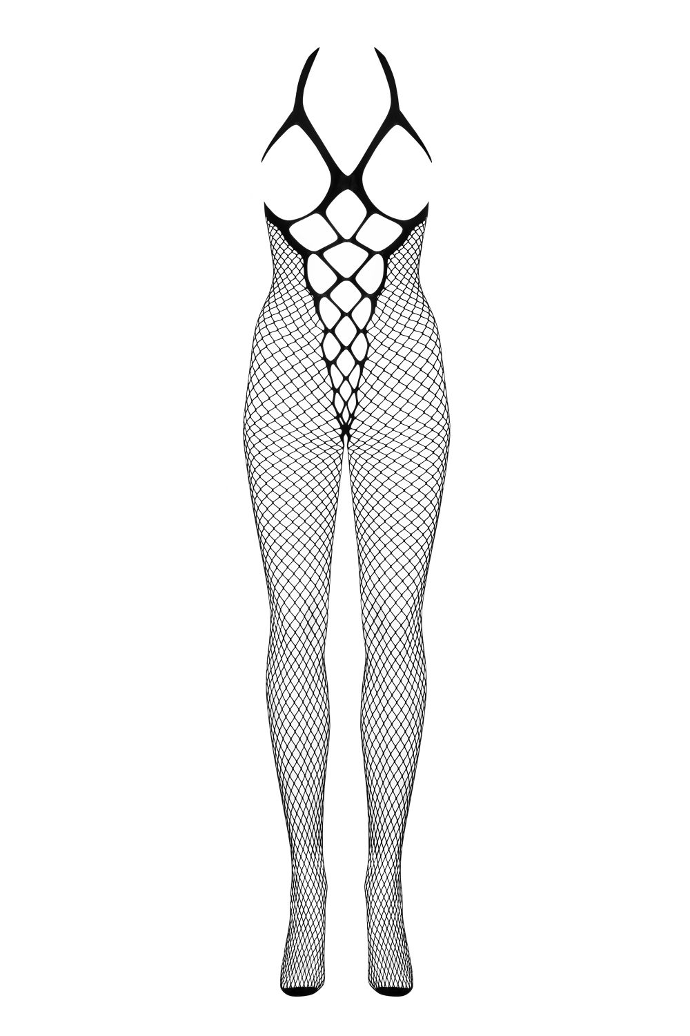 Brustfreier Catsuit in Netz Optik. Mit faszinierenden Lochmuster am oberen Teil. Hinten ziert den aussergewöhnliche Catsuit ein tiefer Ausschnitt. Im Schritt offen (ouvert). Größen: S-L Farbe: schwarz Material: 90% Nylon, 10% Elasthan