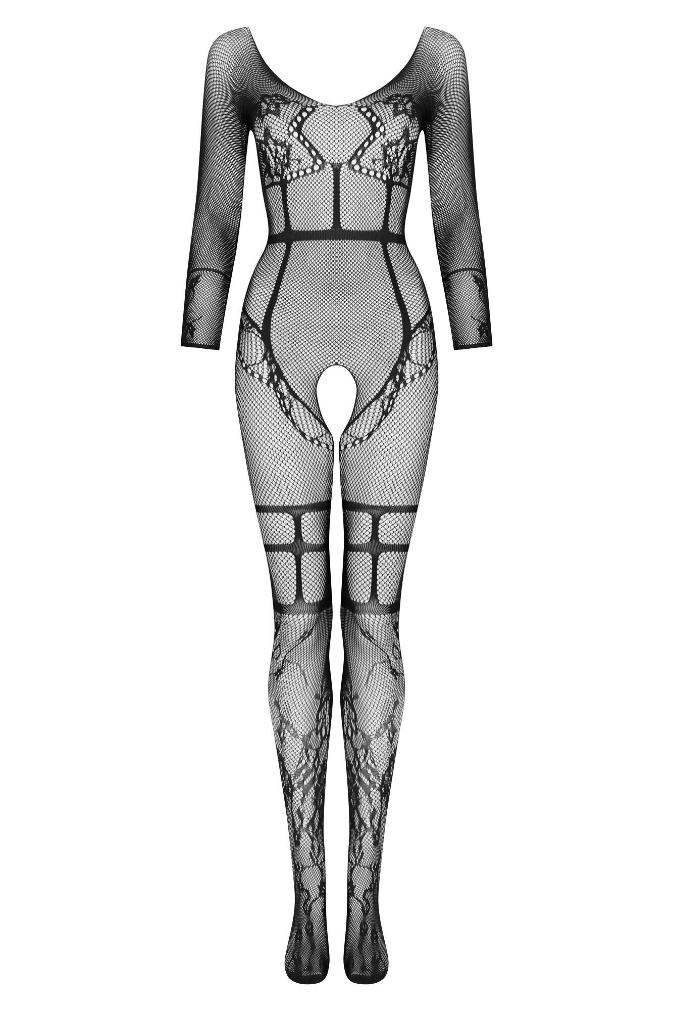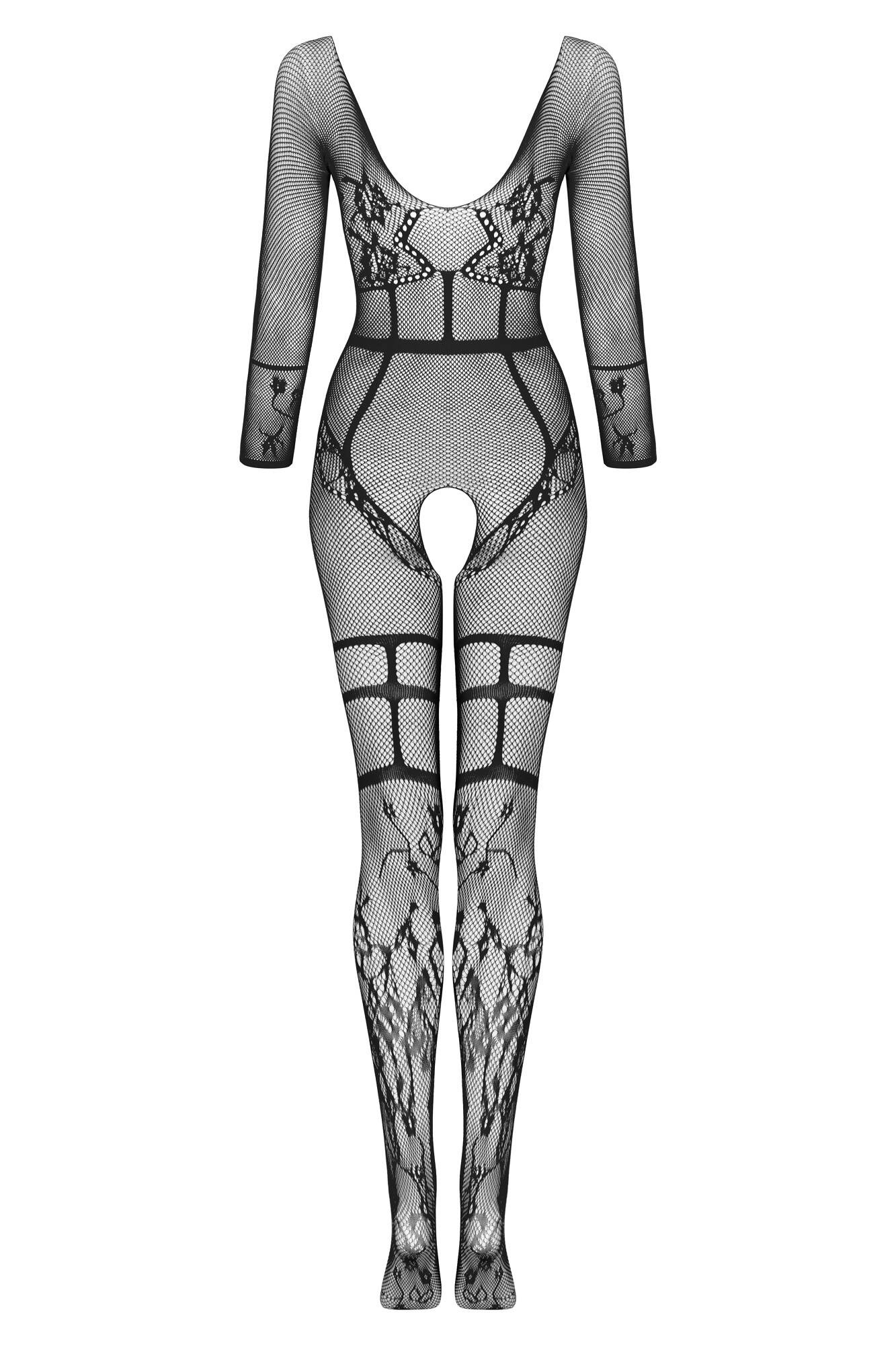 Schwarzer Bodystocking aus gemustertem Stretch-Netz. Im Schritt offen (ouvert).