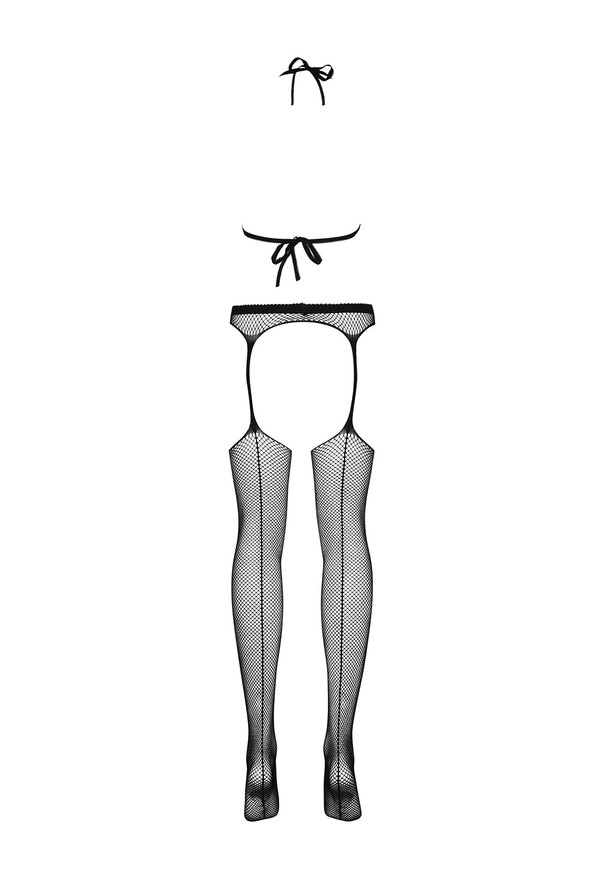 Netz-Catsuit rückenfrei aus hochwertigem und feinmaschigem Stretch-Netz im Straps-Look. Im Nacken und hinten zu binden. Der Scham, Po und Oberschenkelbereich zeigt viel Haut. Im Schritt komplett offen (ouvert).