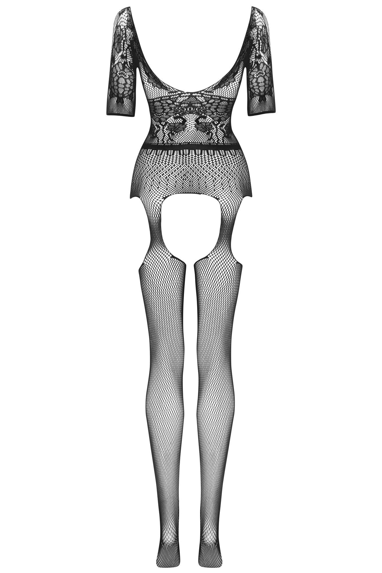 Elastischer Catsuit in Strapsoptik aus schwarzem Netz Mit kurzen Ärmeln und einem aufwendigen Blumenmuster.