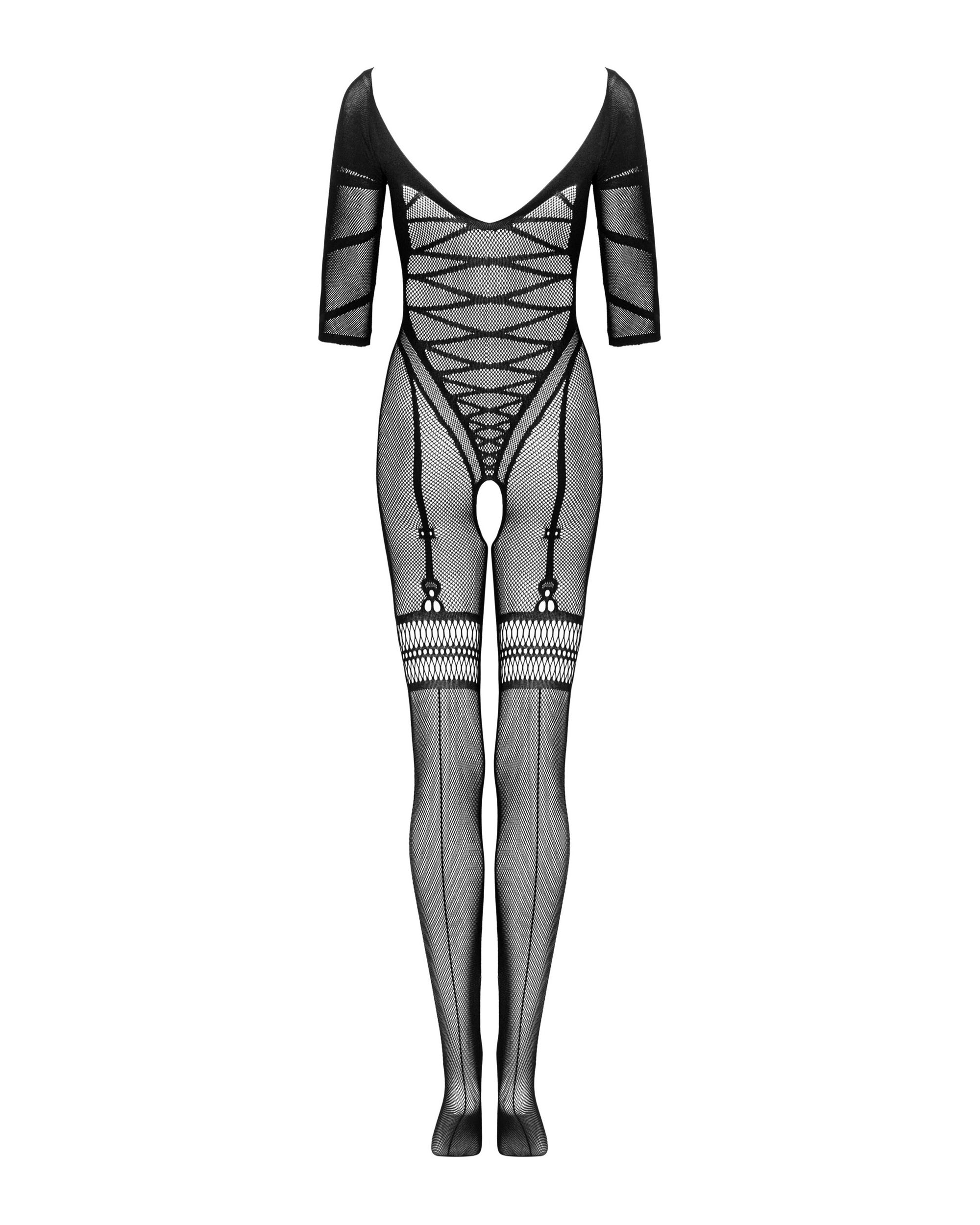 Schwarzer Bodystocking mit Schnür- und Straps-Muster. Aus elastischem Netz mit Rundhals-Ausschnitt. Im Schritt offen (ouvert).