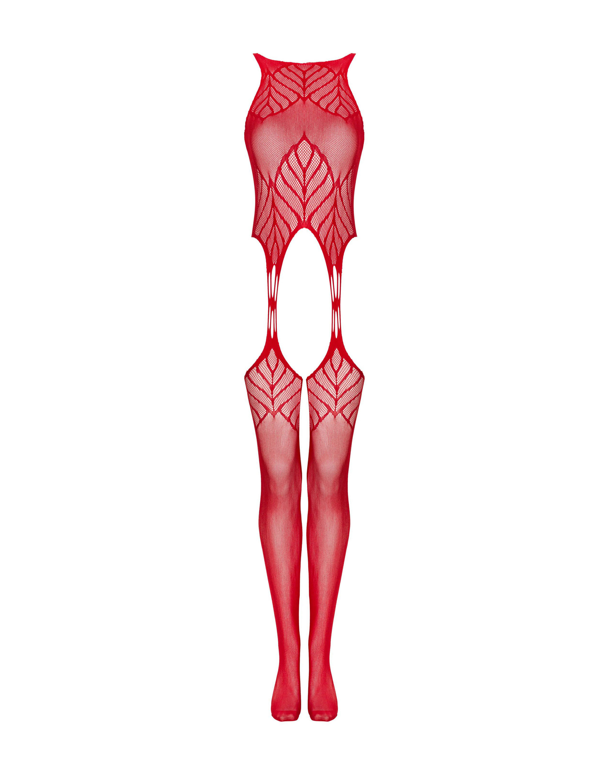 Bodystocking aus rotem Stretch-Netz in Straps-Look. Aus gemustertem, transparentem Material. Ohne String.