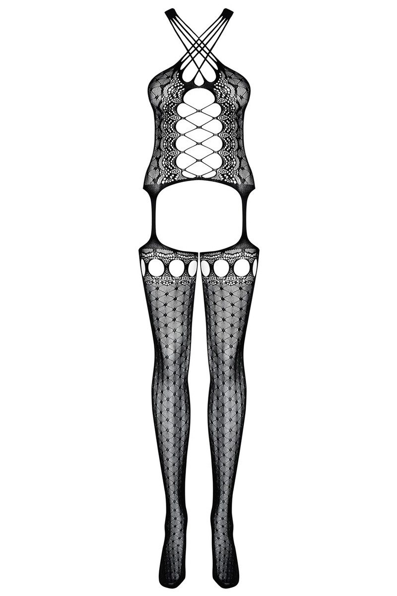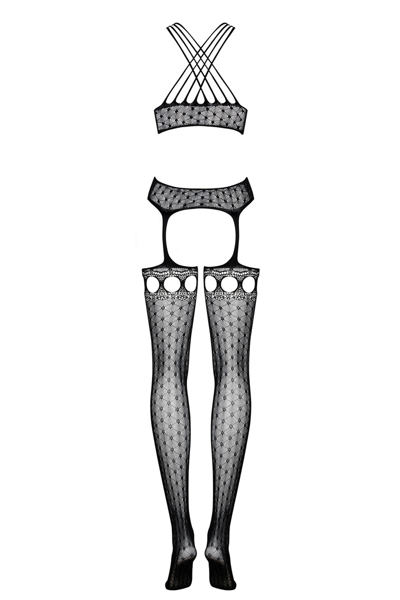 Straps Bodystocking schwarz und gepunktet. Reich verzierter Bodystocking mit geometrischem Motiv und "2 in 1"-Design, das ein Top und angeschlossene Strümpfe beinhaltet. Mit gekreuzten Trägern am Dekolletee und großflächigen Ausschnitten an Bauch, Schenkel und Po. Weiches und elastisches Material. In Einheitsgröße S-L