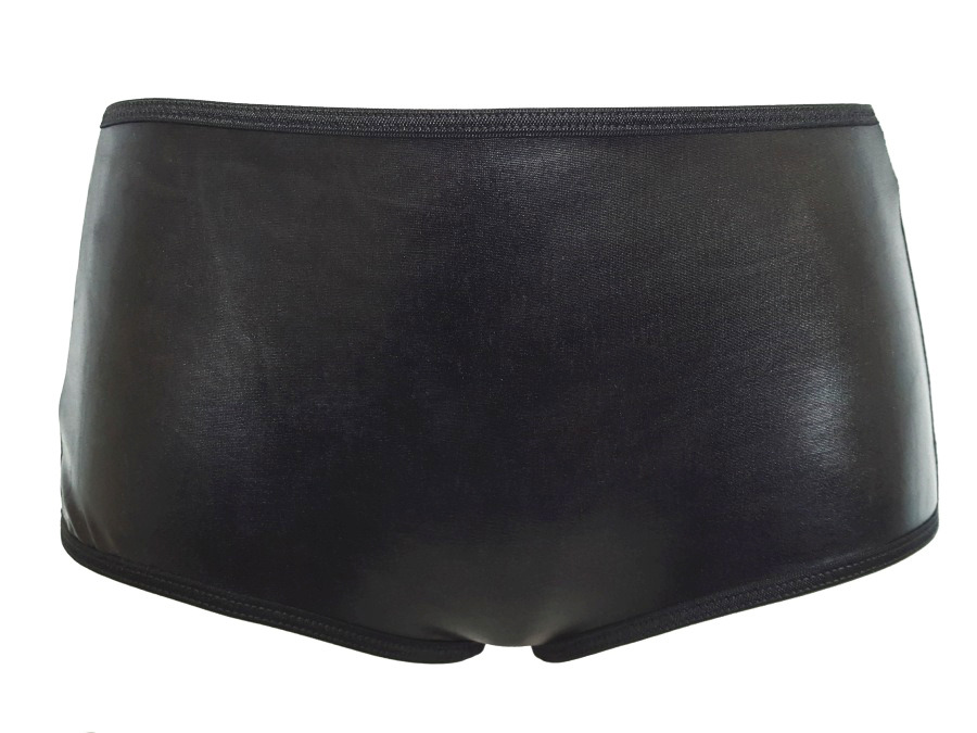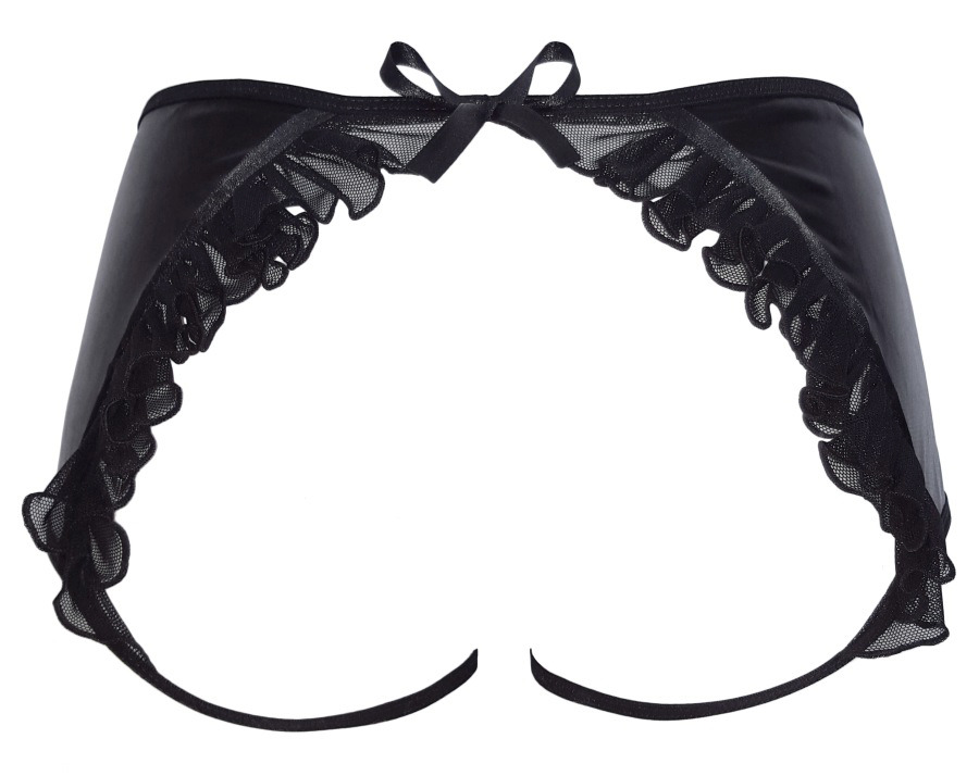 Panty Doris aus einem flexiblen glänzenden sowie latexähnlichem Material. Auf der Rückseite mit einem provokativen Ausschnitt, welcher mit einer Rüsche und einem Satinband verziert ist.