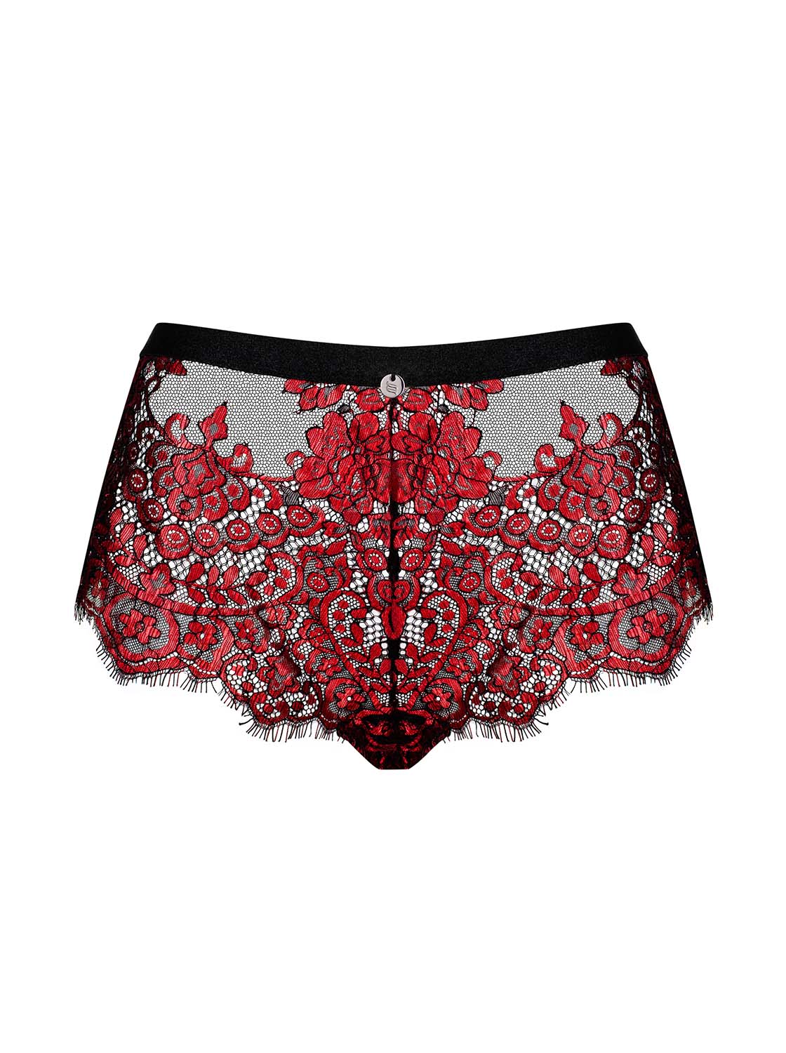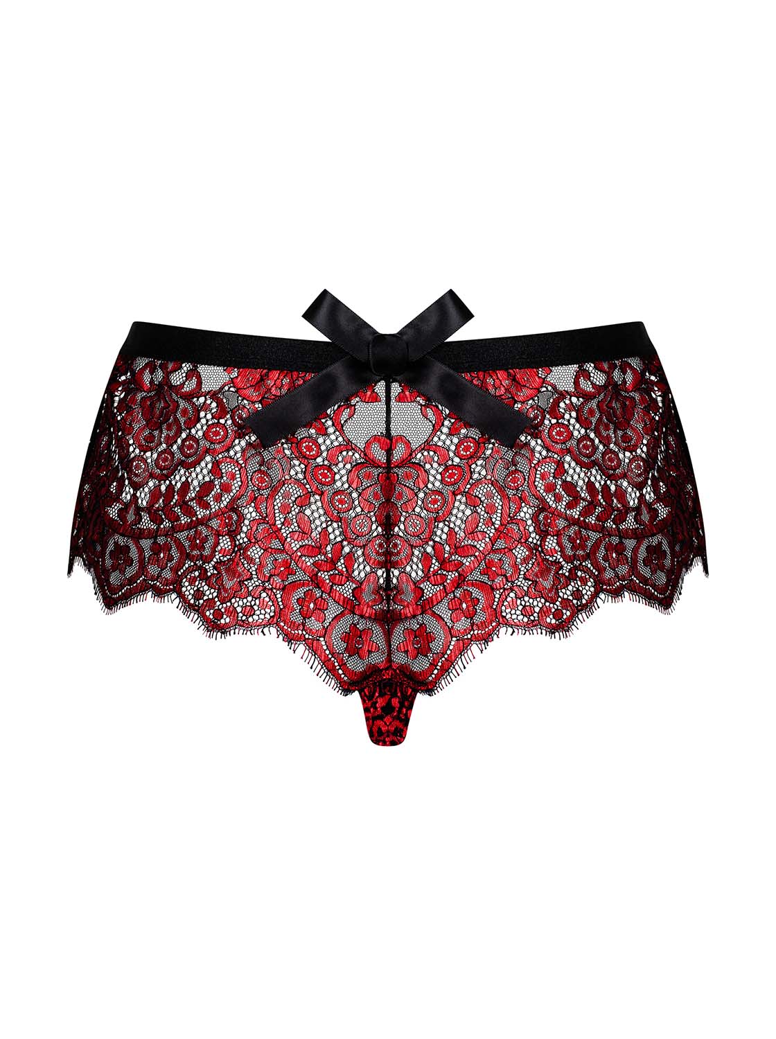 Höschen aus schwarzem Netz-Material mit aufwendiger roter Spitze. Aus elatischem Material genäht. Hinten mit einer Satinschleife.
