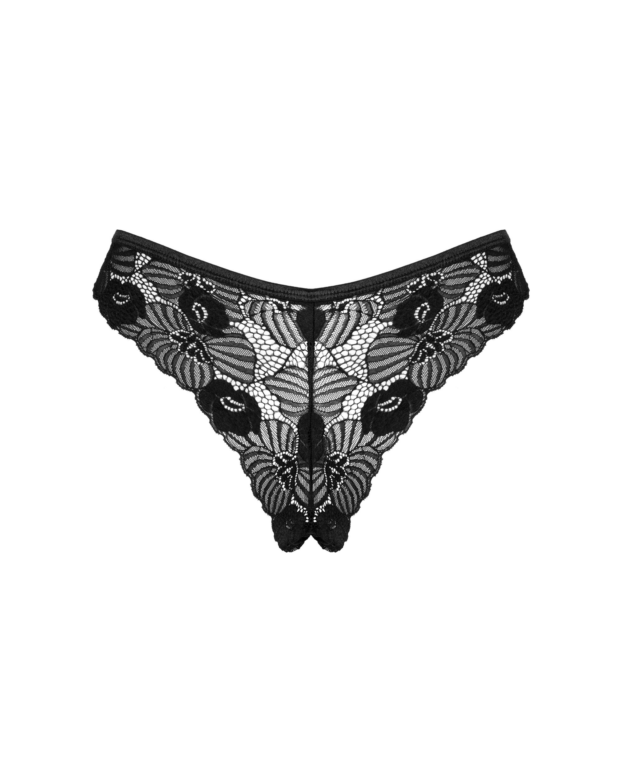 Schwarzes Höschen aus transparentem Stretch-Material. Mit Blumenmotiv. mehr