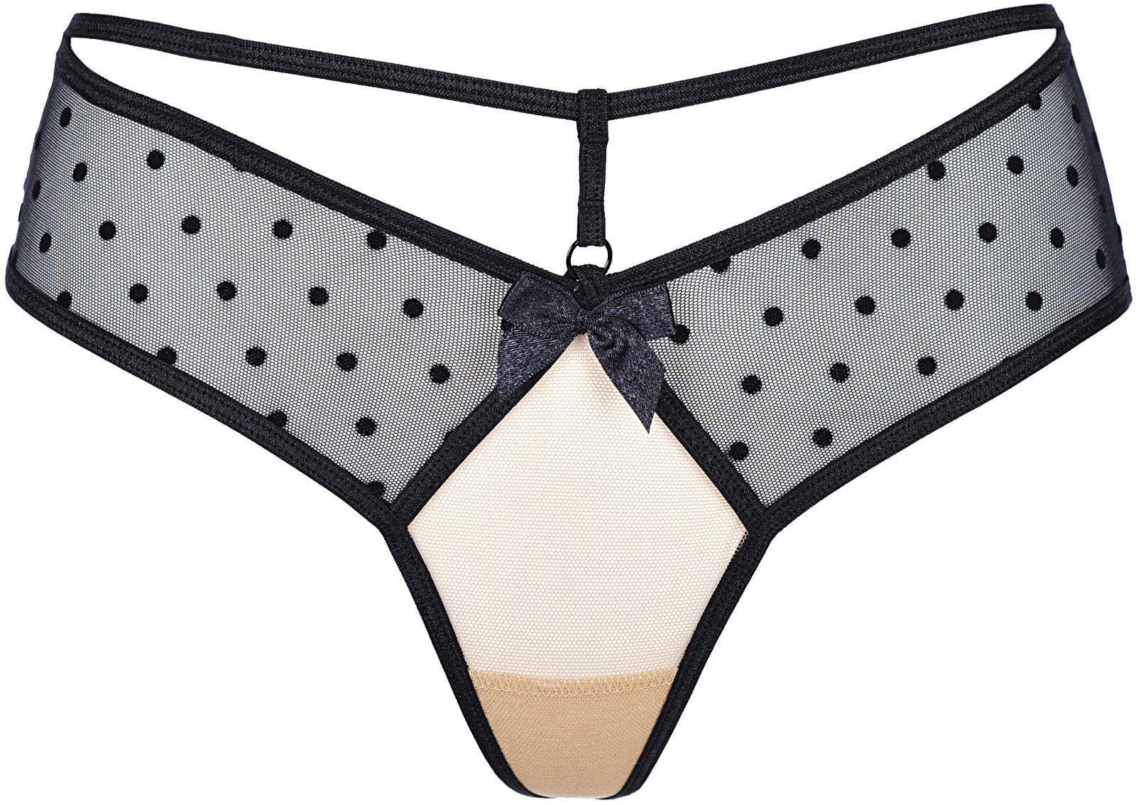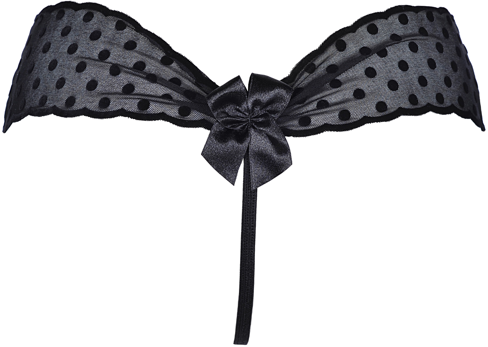 Schwarzer String aus weichem Mesh. Mit Pünktchenmuster und Schleifen vorne und hinten. Vorne aus beigefarbenem Material, so dass der String ouvert wirkt.