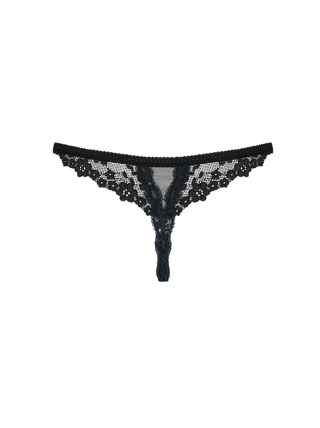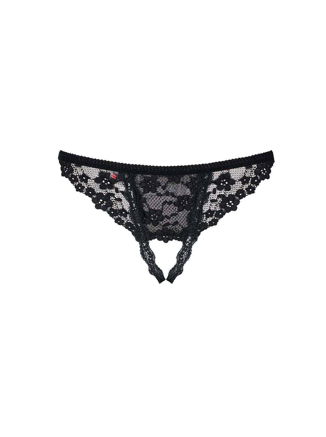 Ouvert-String mit Blumenmuster und Spitzenverzierung. Aus elastischem, transparentem Material. Verfügbare Größen: S/M, L/XL
