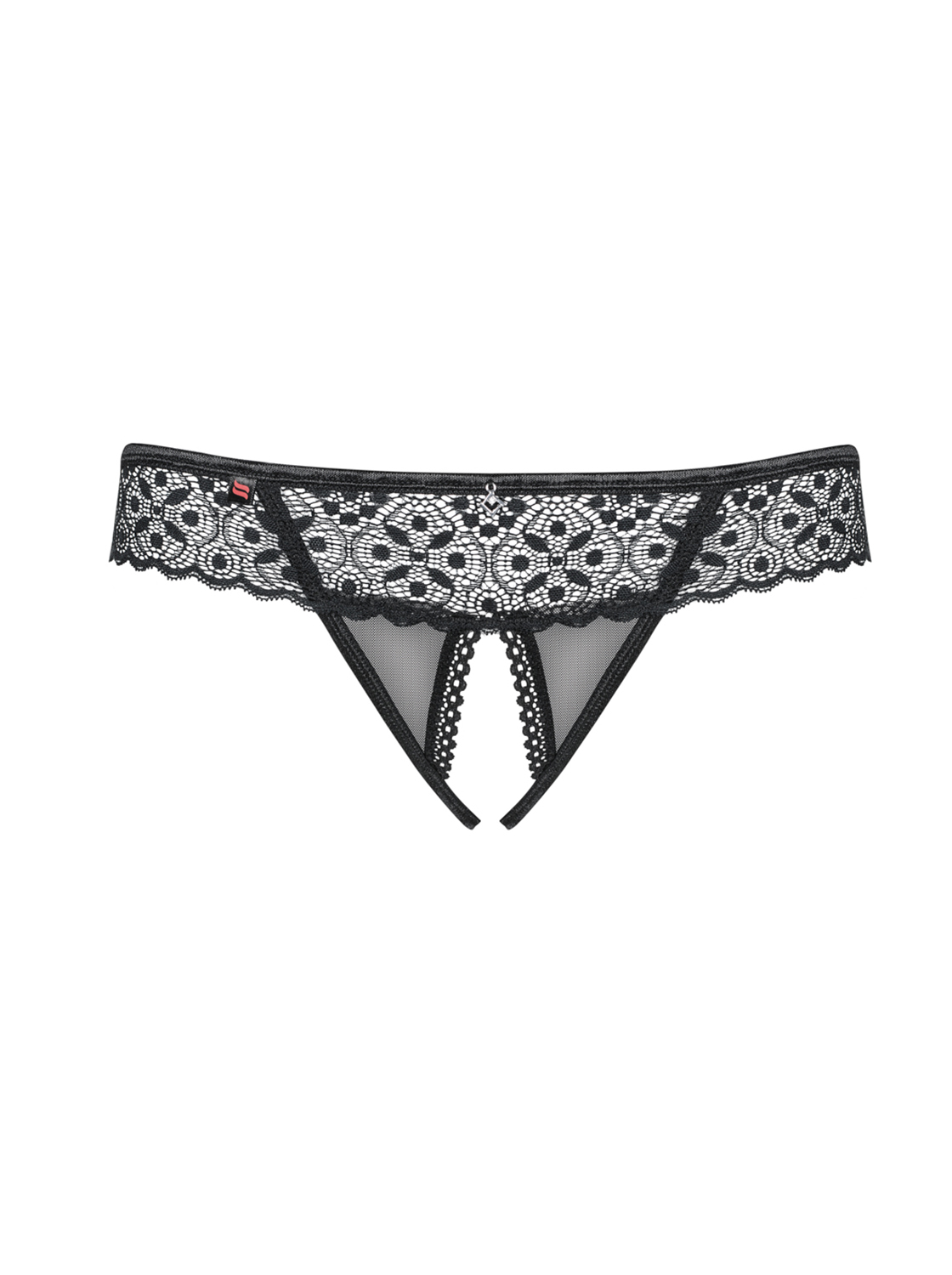 Offener String in schwarz aus elastischem Material. Mit Spitze und einem Schmuckdetail vorne. Elegant gemustert und transparent. Verfügbare Größen: S/M, L/XL
