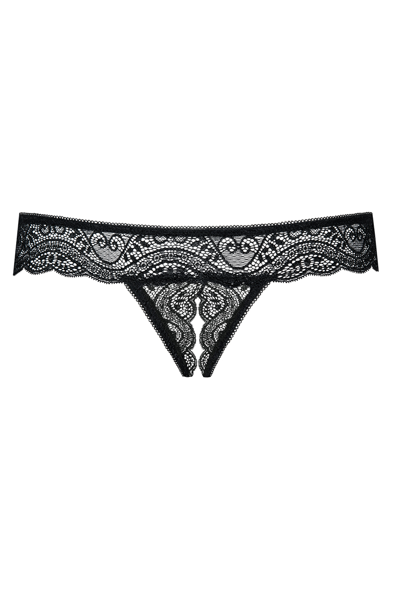 Ouvert-String in schwarz mit Spitze und glänzenden Steinen. Mit offenem Schritt. Schönes und... mehr