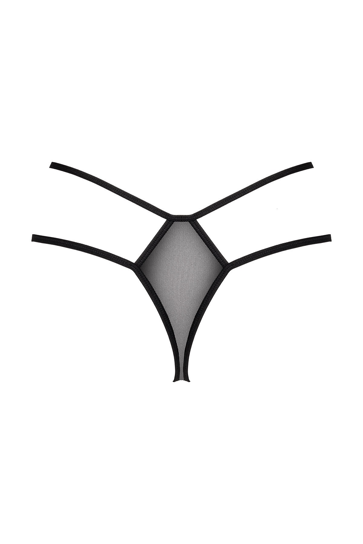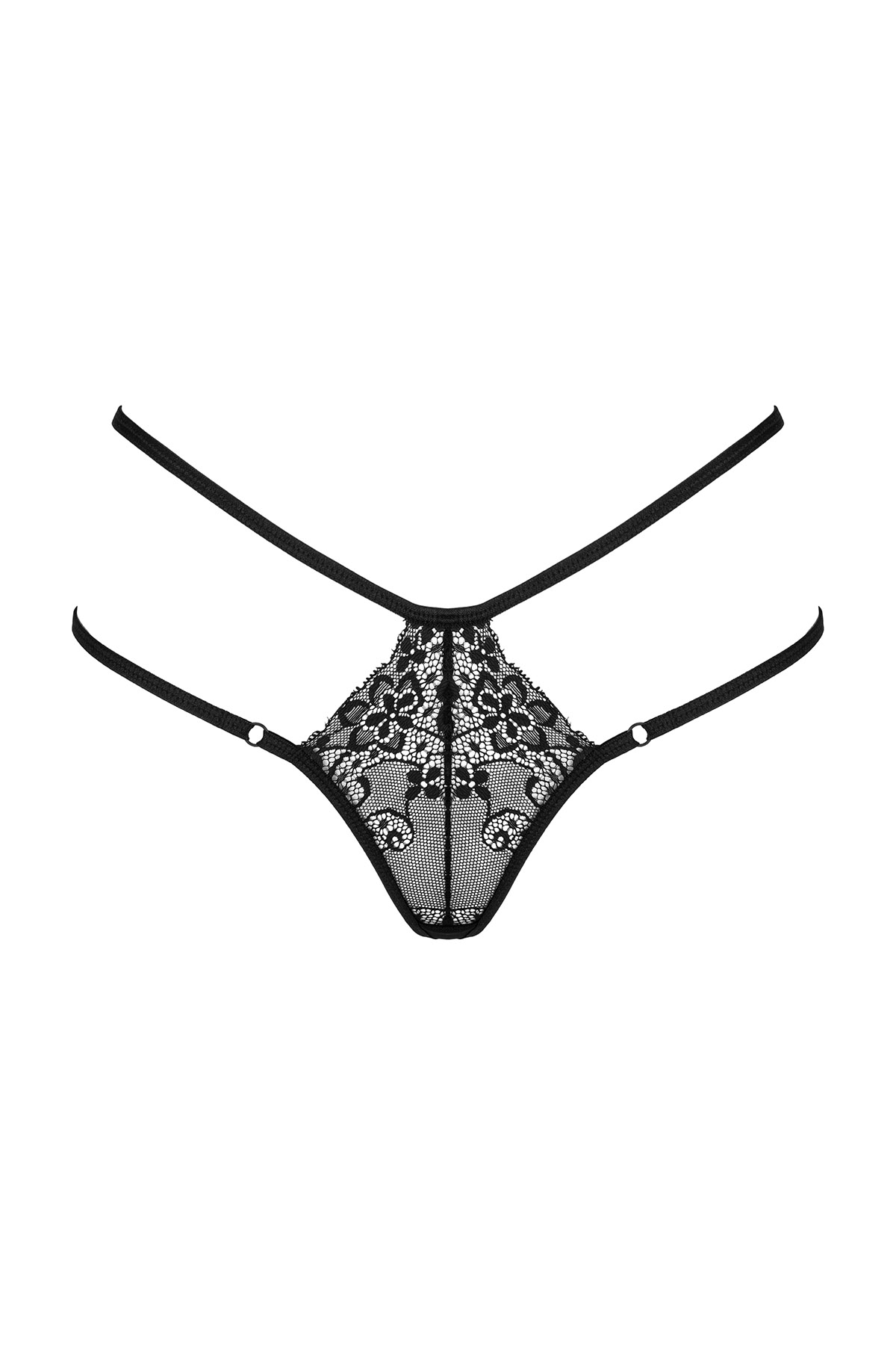 String in schwarz mit elastischen Riemchen. Mit floraler Spitze und Tüll.