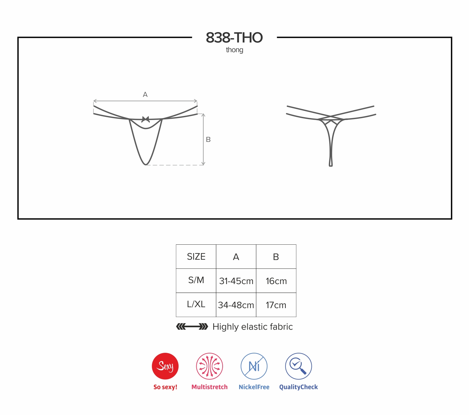 String Emeline in rot von Obsessive mit verführerischem Ausschnitt und Schleife mit glänzendem Schmuckdetail sowie doppelten Riemchen. Schönes und elastisches Material, mit Spitze verziert. Verfügbare Größen: S/M, L/XL