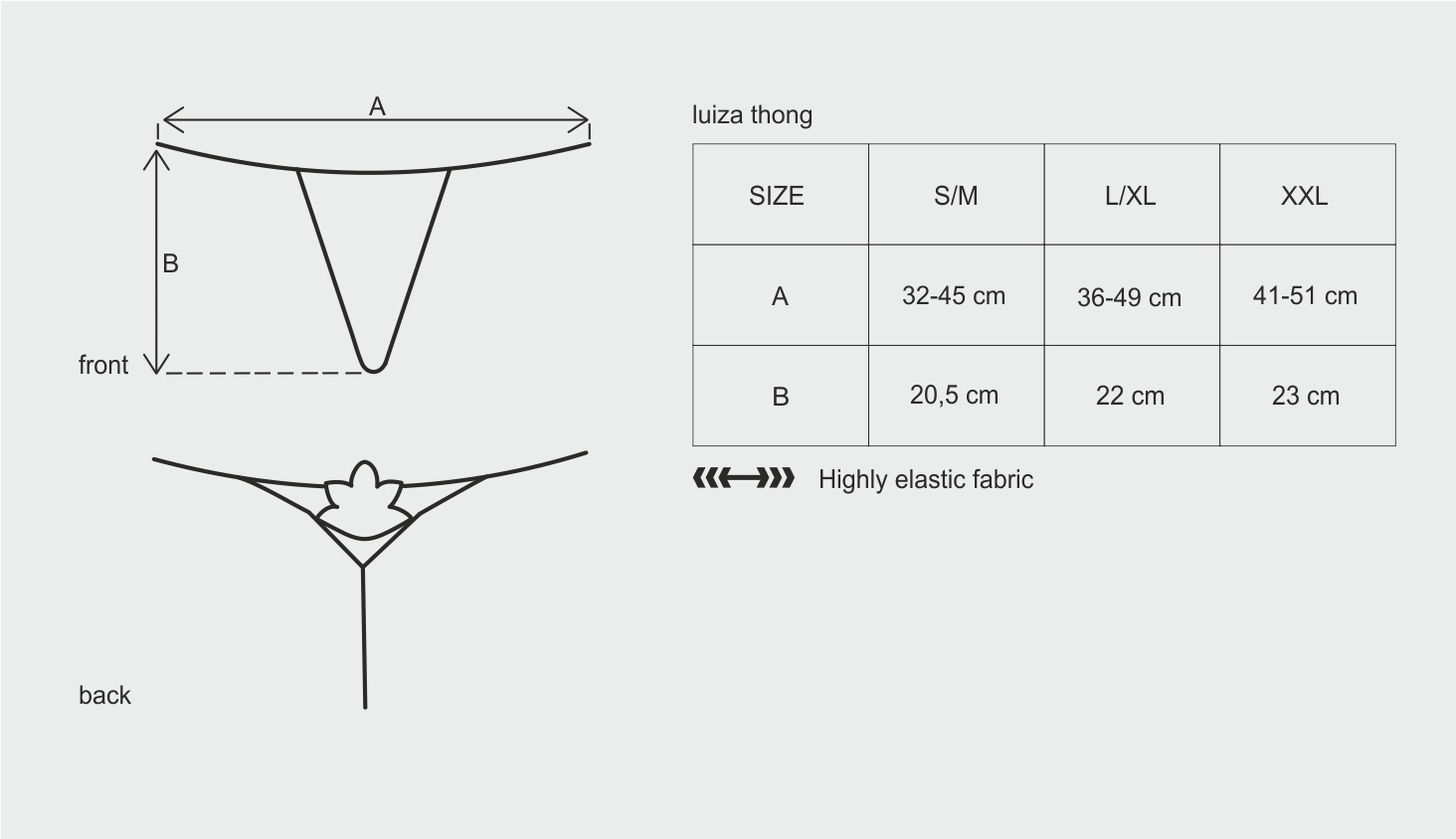 Sexy String in schwarz aus edler Spitze und zartem Tüll. Größe: S/M, L/XL Material: 94% Nylon, 6% Elasthan Farbe: Schwarz