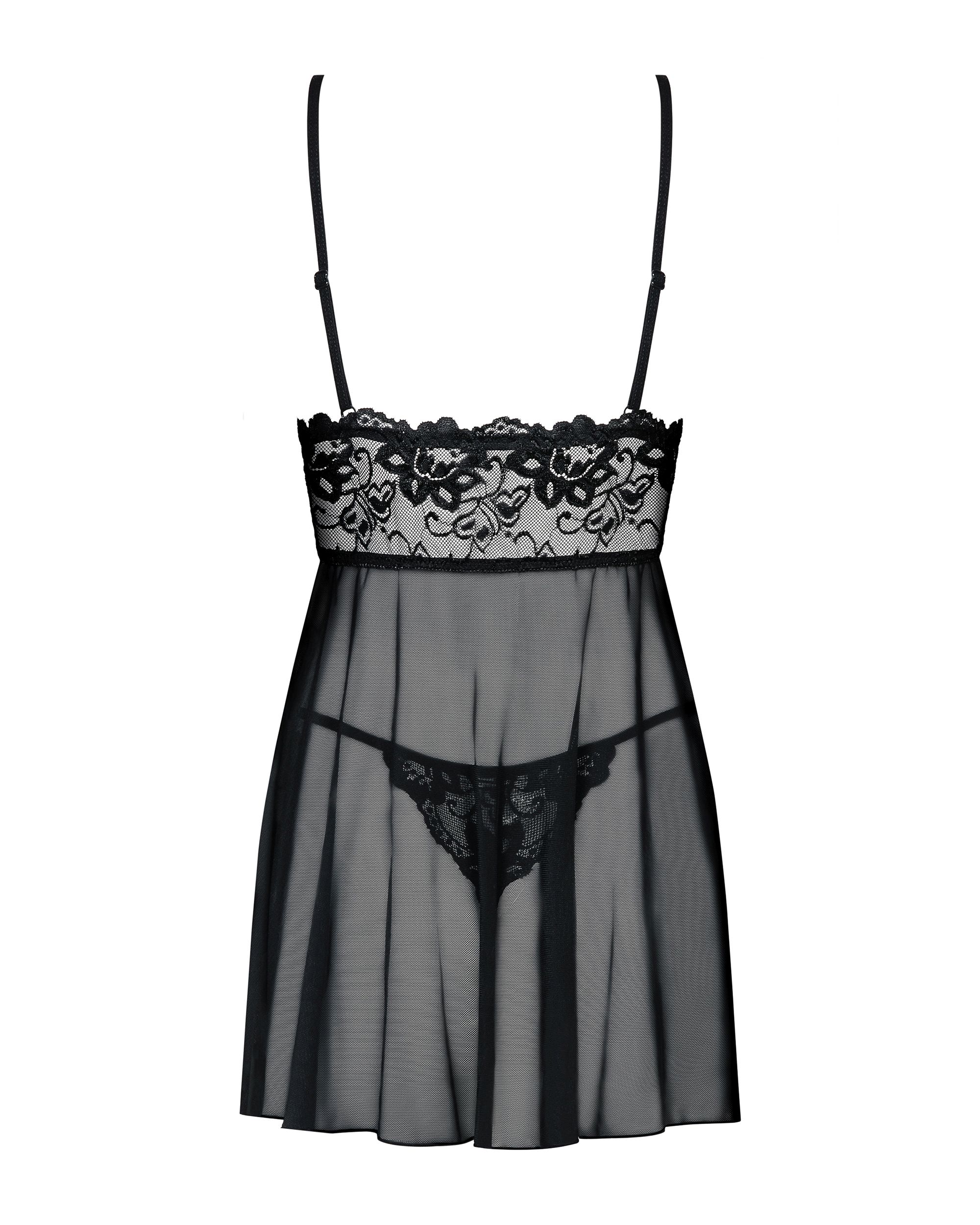 Dieses schwarze Babydoll ist im oberen Brustbereich aus feiner Spitze verarbeitet. Umhüllt wird das Babydoll von feinem Tüll. Der passende String ist inklusive.