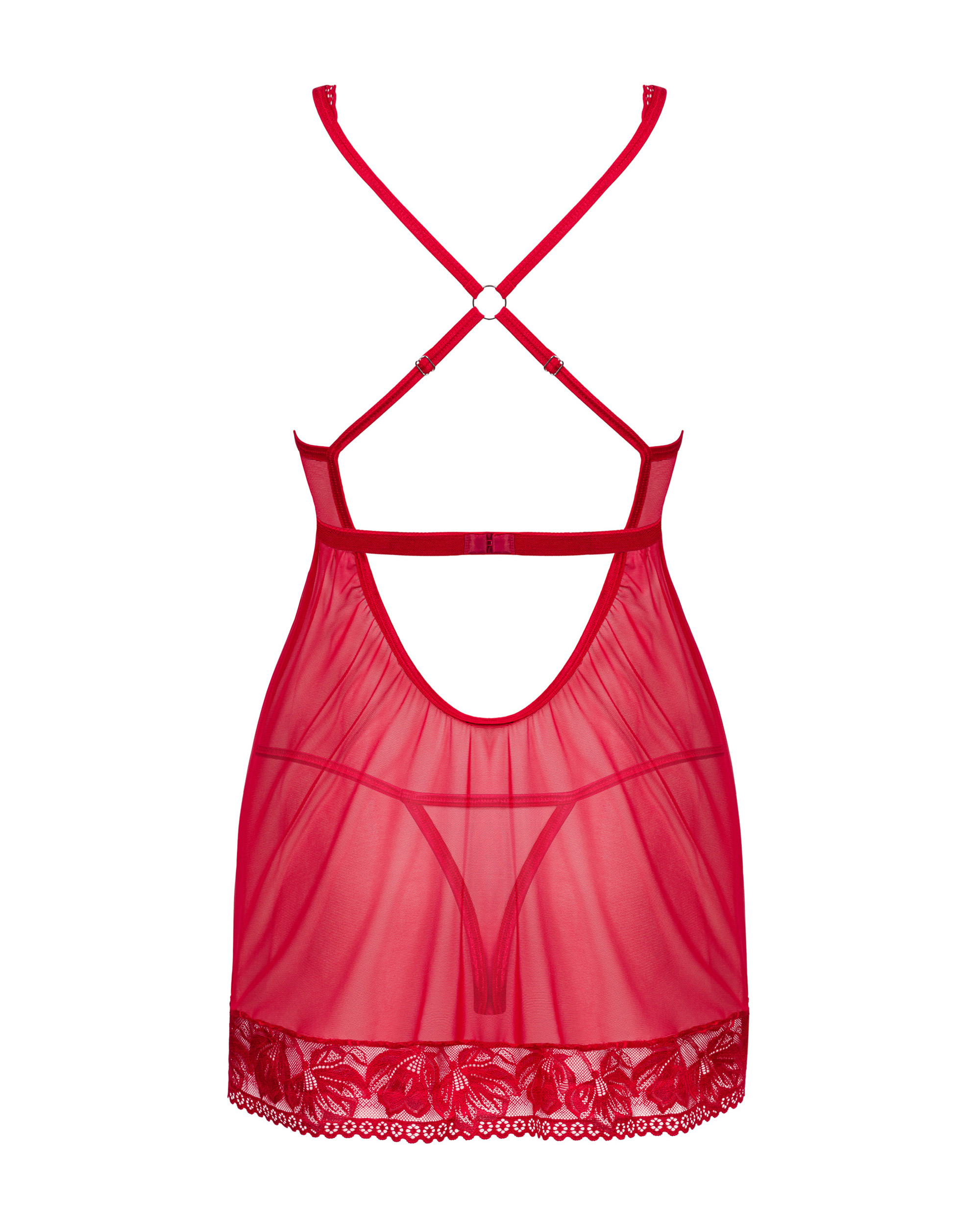 Rotes Nachthemd aus transparentem Stoff mit Spitze. Mit Bügel-Cups und verstellbaren Trägern. Das Babydoll ist rückenfrei und floral gemustert. Inklusive String.