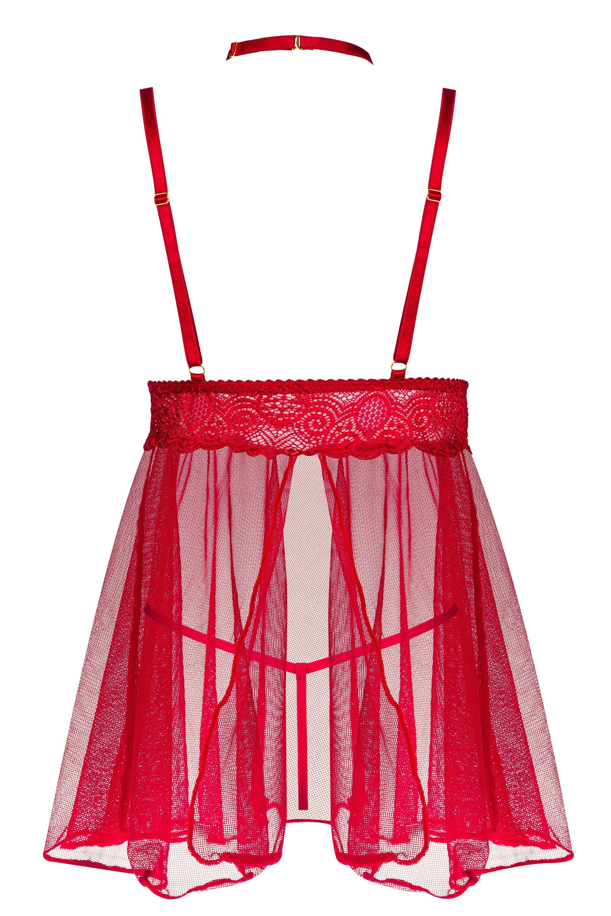 Rotes Nachthemd aus transparentem Tüll und Spitze. Das Halsband mit Riemen ist abnehmbar. Im Set mit String.