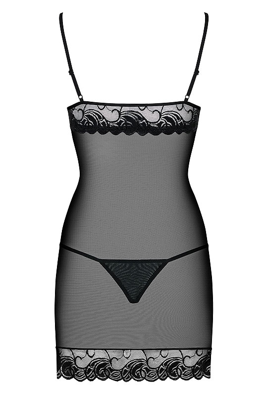 Zarte, transparente Chemise mit außergewöhnlichem Schnitt, eine Kombination aus glattem Netzmaterial und feiner Spitze. Mit verstellbaren Trägern, spitzenverzierten Cups mit Schleife und einem elastischen Bund. Passender String inklusive.