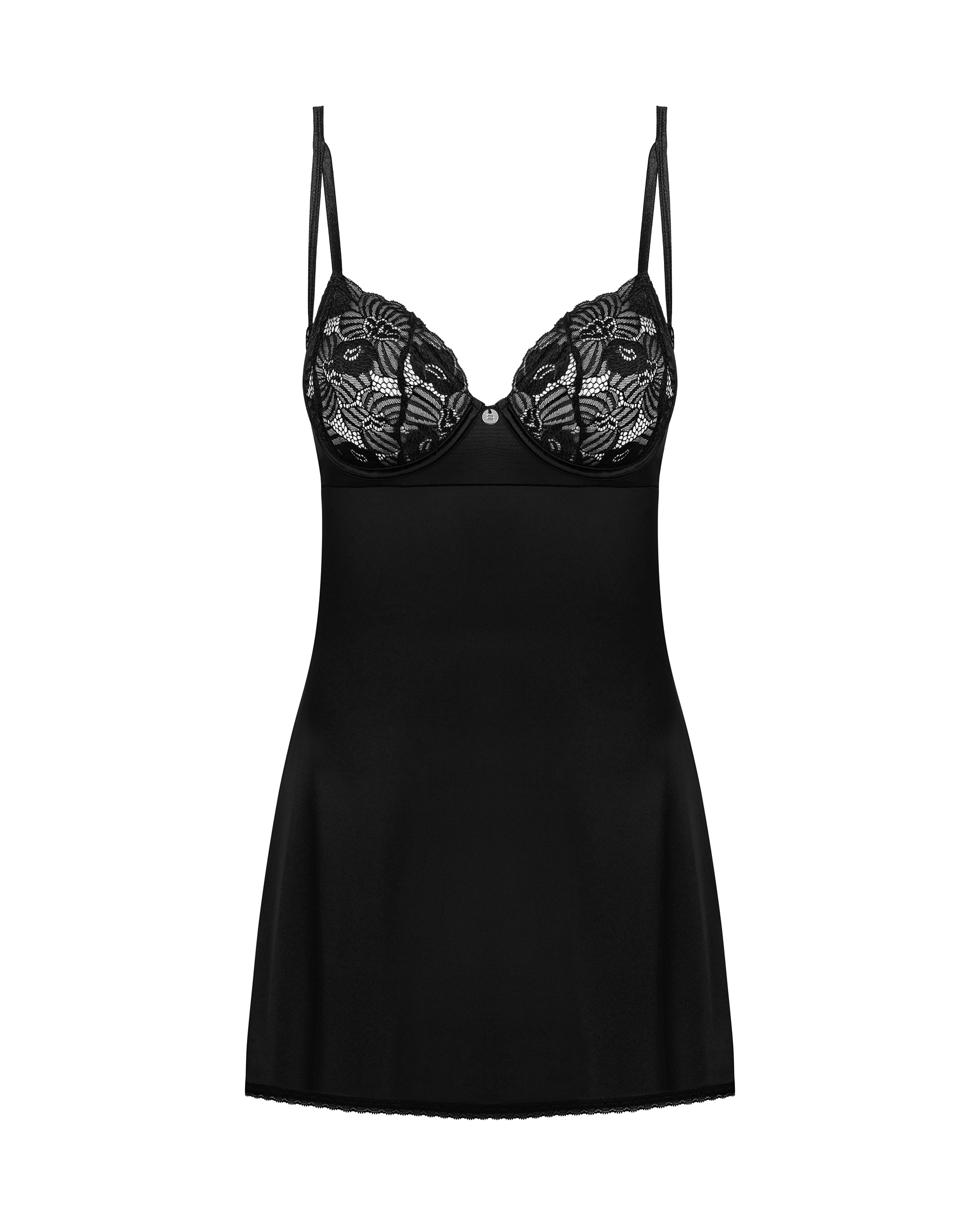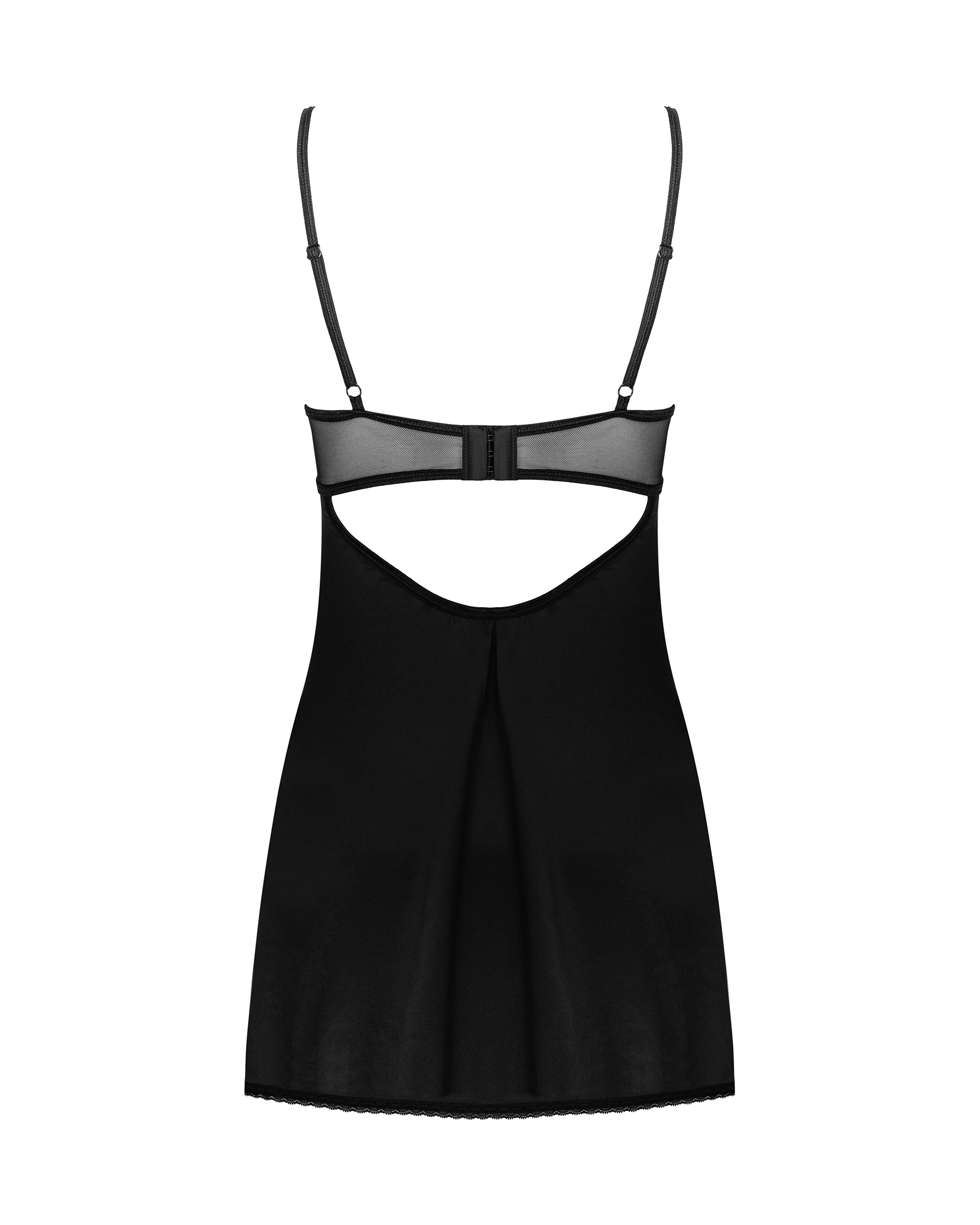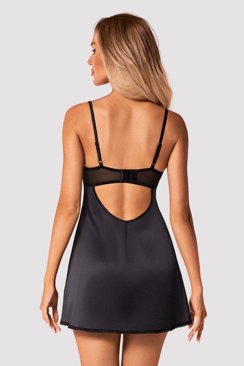 Negligee mit String in schwarz aus leicht schimmerndem Stoff. Träger und Rückenverschluss sind verstellbar. Mit teiltransparenten Bügel-Cups.