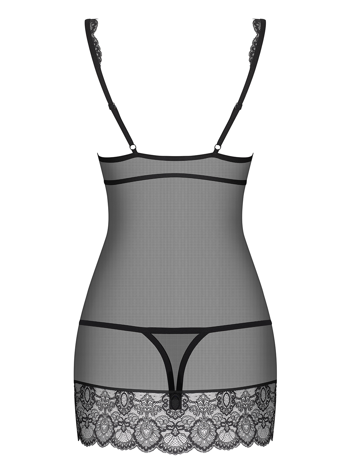 Negligee in schwarz mit spitzenverzierten Bügel-Cups. Die Körbchen sind mit einem beigefarbenen Stoff gepolstert und heben so das Blumenmuster hervor. Mit einem breiten Spitzensaum. Inklusive einem passenden String.