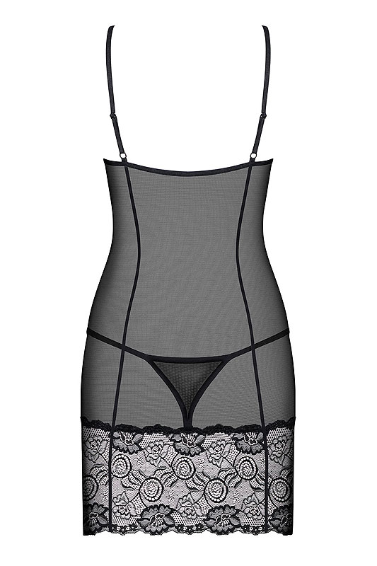 Negligee mit String aus glattem Material mit verstellbaren Trägern und durchsichtigen Bügel-Cups. Die vertikalen Nähte lassen Ihre Figur schlanker erscheinen. Der breite Saum ist aus Spitze genäht. Ein passender String ist im Lieferumfang enthalten.