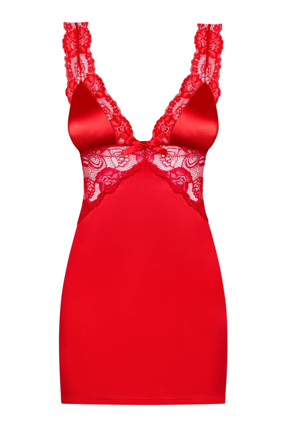 Negligee Secred in rot von Obsessive. Romantisches Chemise aus rotem Satinmaterial, das sich elastisch dem Körper anpasst. Verstellbare Träger für eine optimale Passform und Spitzendetails im Brustbereich und an den Seiten. Passender String enthalten.