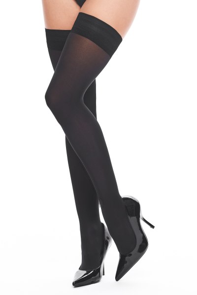 Halterlose Strümpfe aus schwarzem Stretch-Material. Ohne Muster und in Materialstärke 50 DEN. Selbsttragend (mit Silikon)