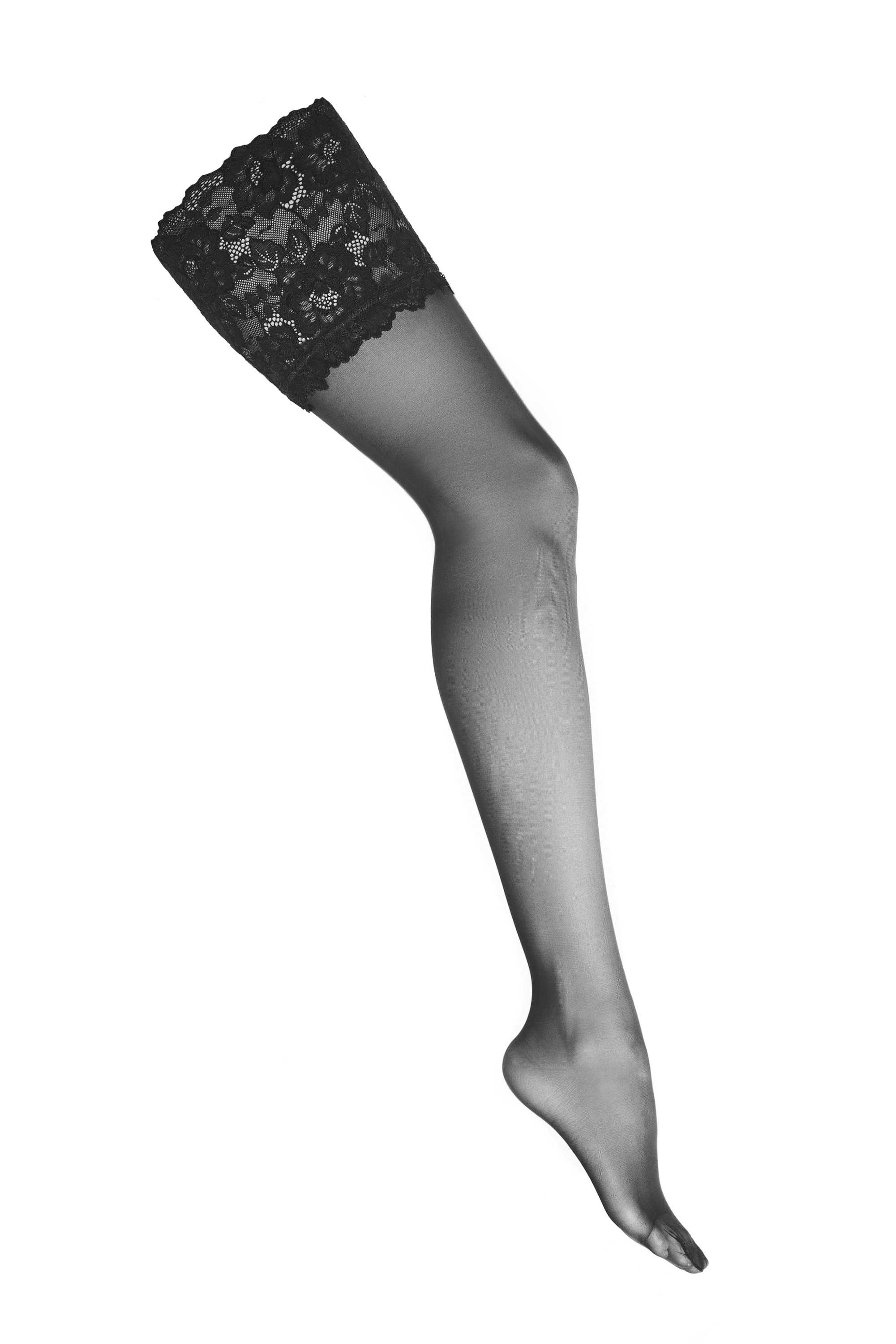 Schwarze Strapsstrümpfe mit einem breiten Spitzenrand mit floralen Motiven. Nicht Selbsttragend mehr