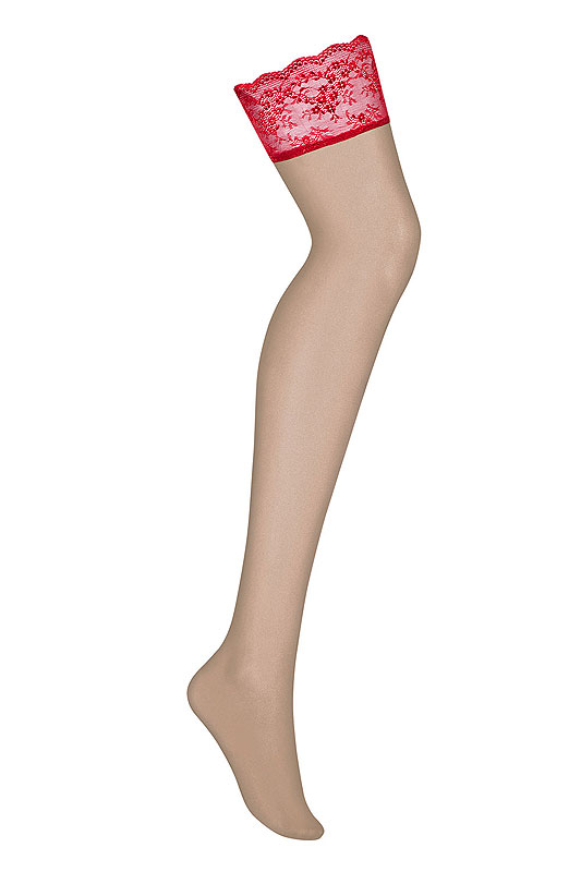 Strümpfe Lovica rot von Obsessive. Eine klassische Kombination aus roter Spitze mit Blumenmuster und hautfarbenem Tüll. Schönes und elastisches Material. Verfügbare Größen: S/M oder L/XL Farben: Hautfarben mit roter Spitze