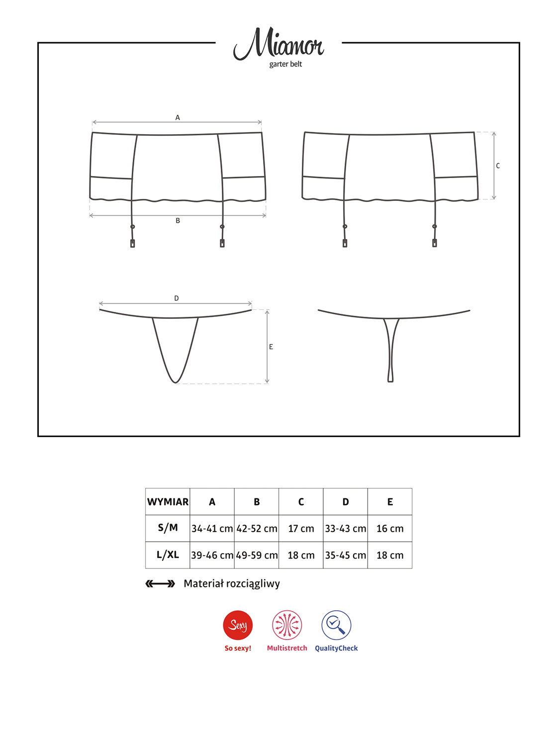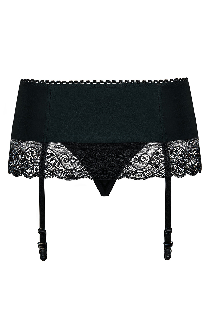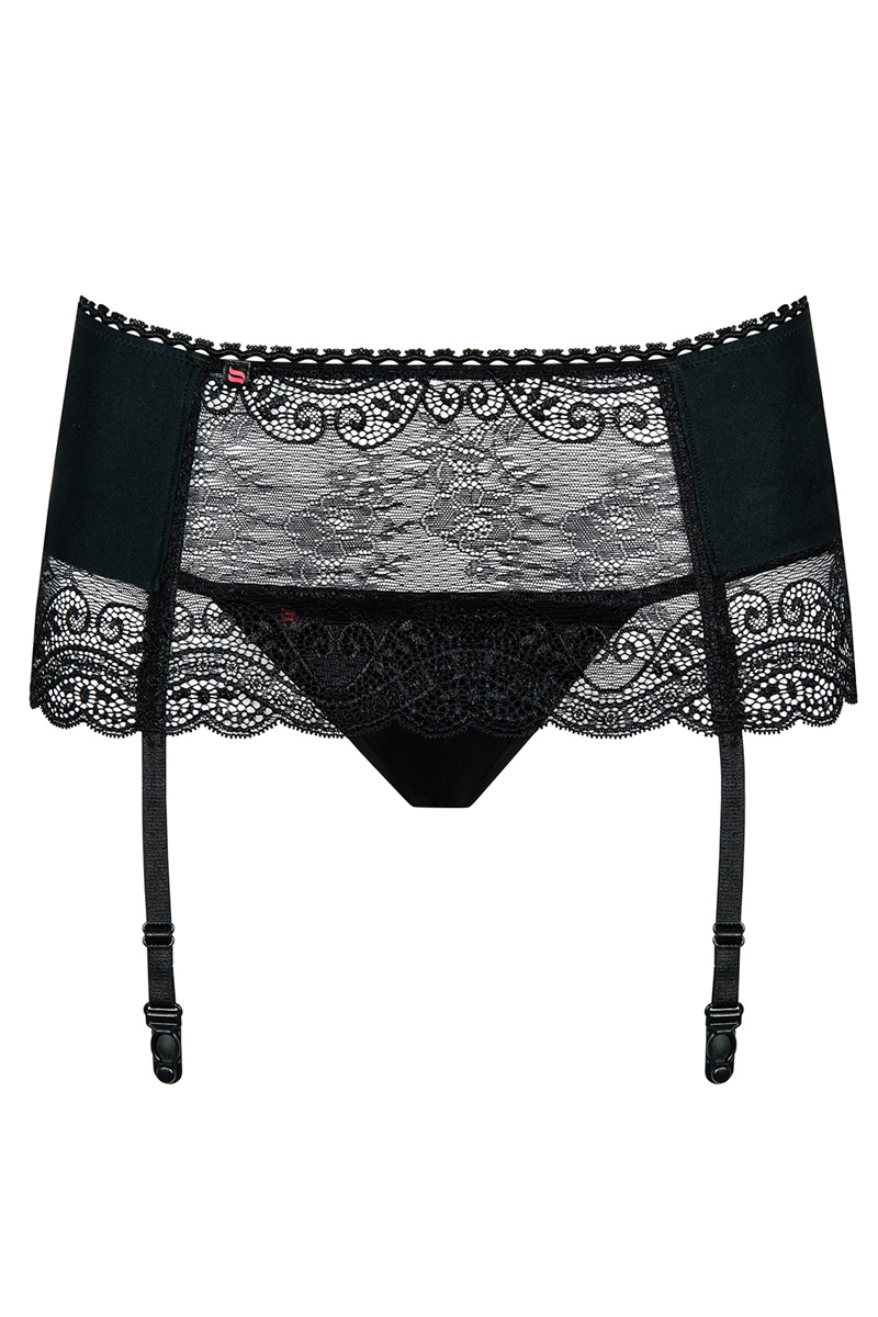 Strapsgürtel Miamor in schwarz aus zartem, elastischem Material mit Spitzendetails. Mit verstellbaren Strumpfhaltern, inklusive schwarzen String. Verfügbare Größen: S/M oder L/XL