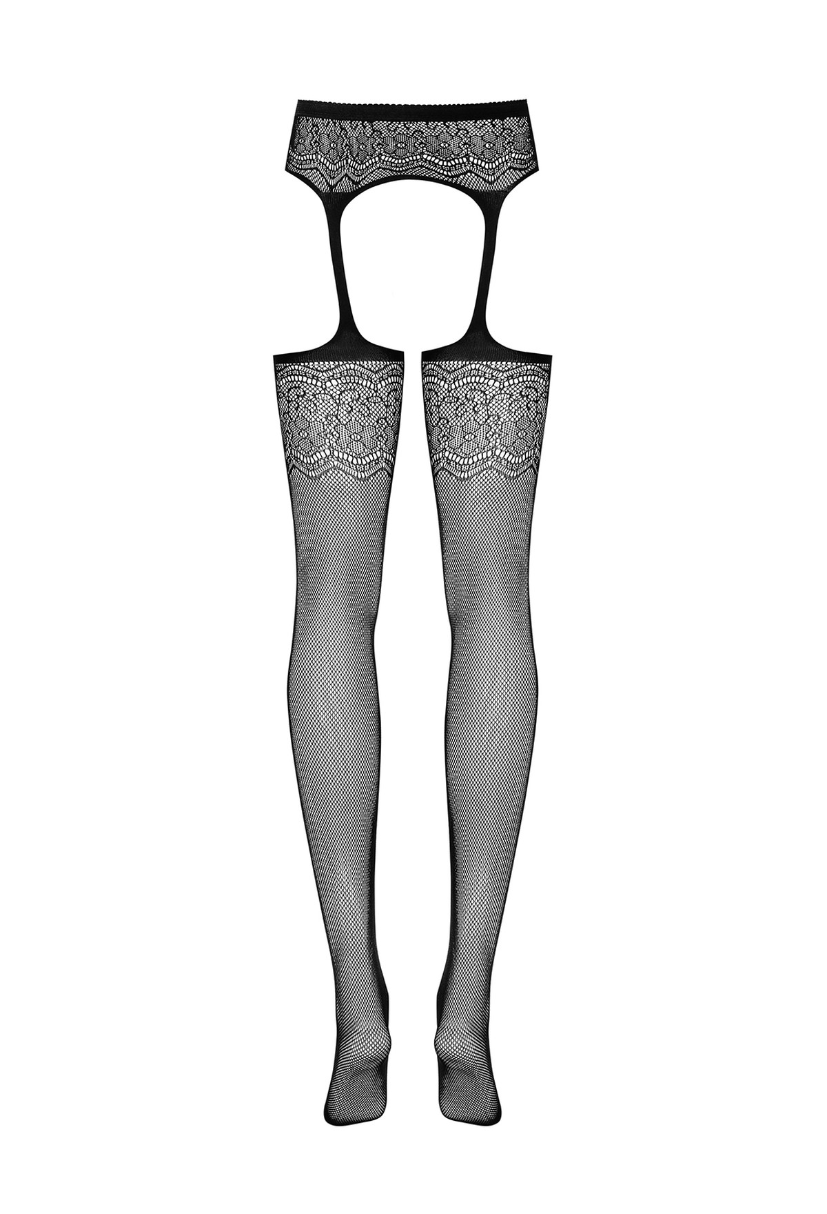 Ouvert-Strapsstrümpfe mit Blumenmotiv in schwarz von Obsessive. Strumpfhalter und Strümpfe in einem: Verziert mit zartem, floralem Motiv. Aus weichem und elastischem Material, im Schritt offen.