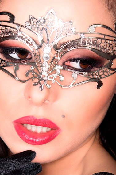 Silberne Messing-Maske von Chilirose. Diese geheimnisvolle Maske aus Messing ist verziert mit glitzernden Kristallen. Sie lässt sich mit Satinbändern festbinden und perfekt anpassen. Farbe: silber Material: 100% Messing
