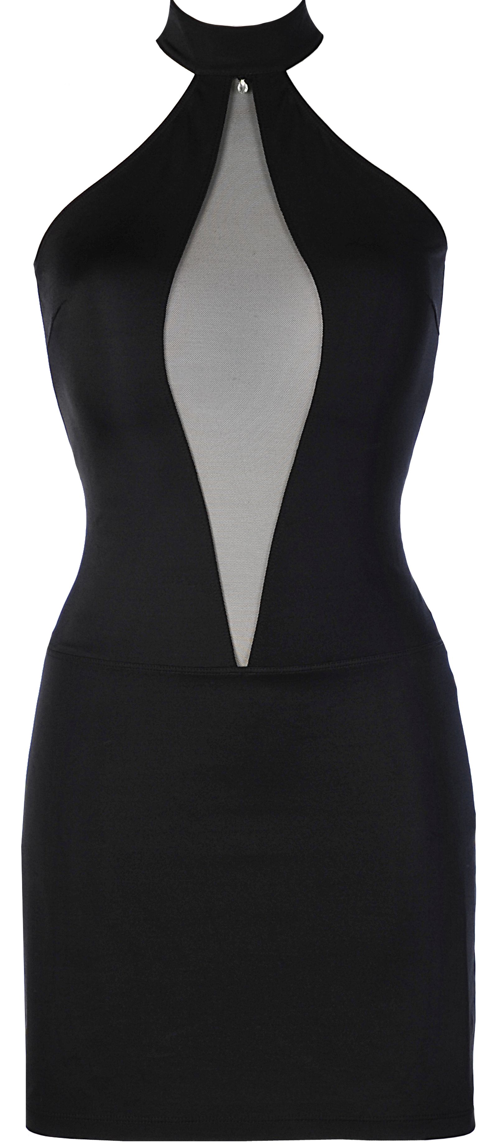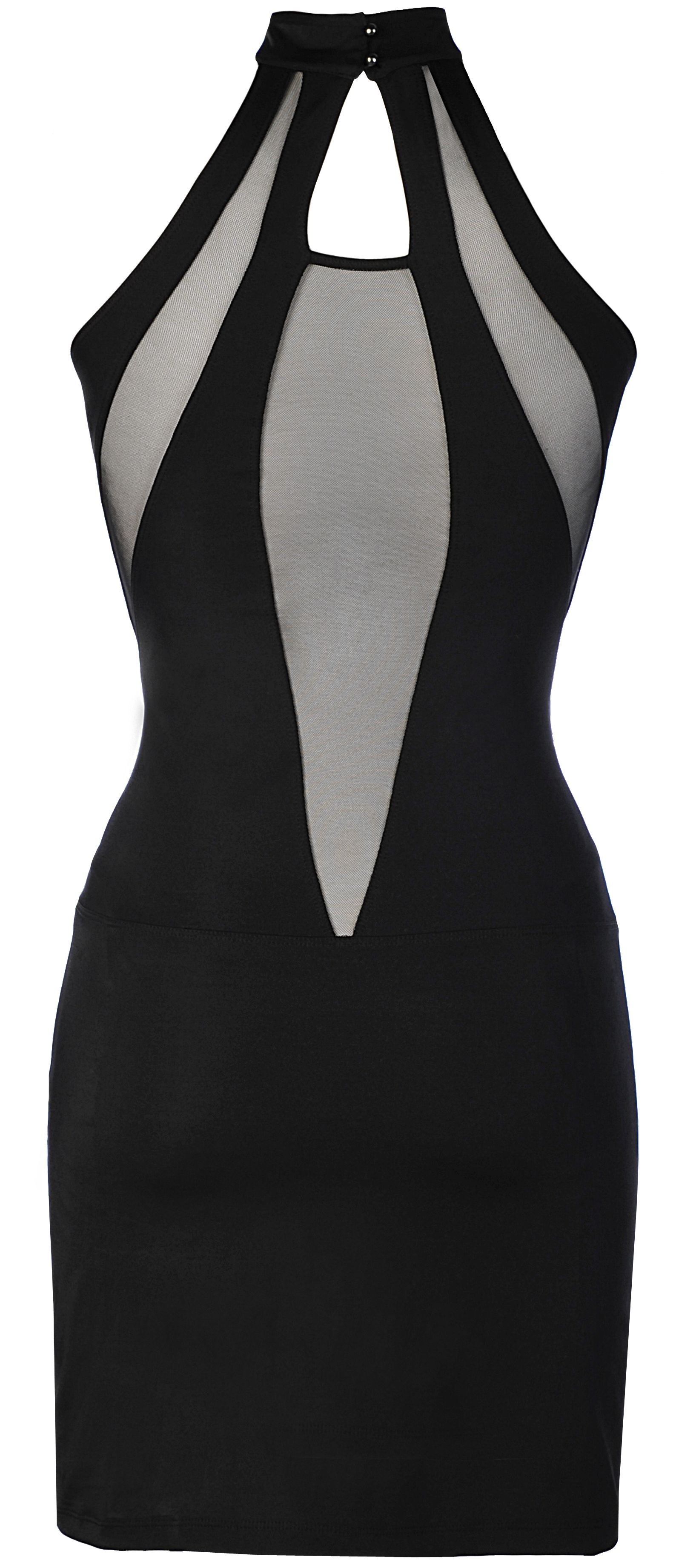 Abendkleid aus schwarzem, elastischem Material. Vorne mit einem glänzendem Schmuckdetail verziert. Wird hinten am Nacken geschlossen. Vorne und hinten mit durchsichtigen Tülleinlagen.