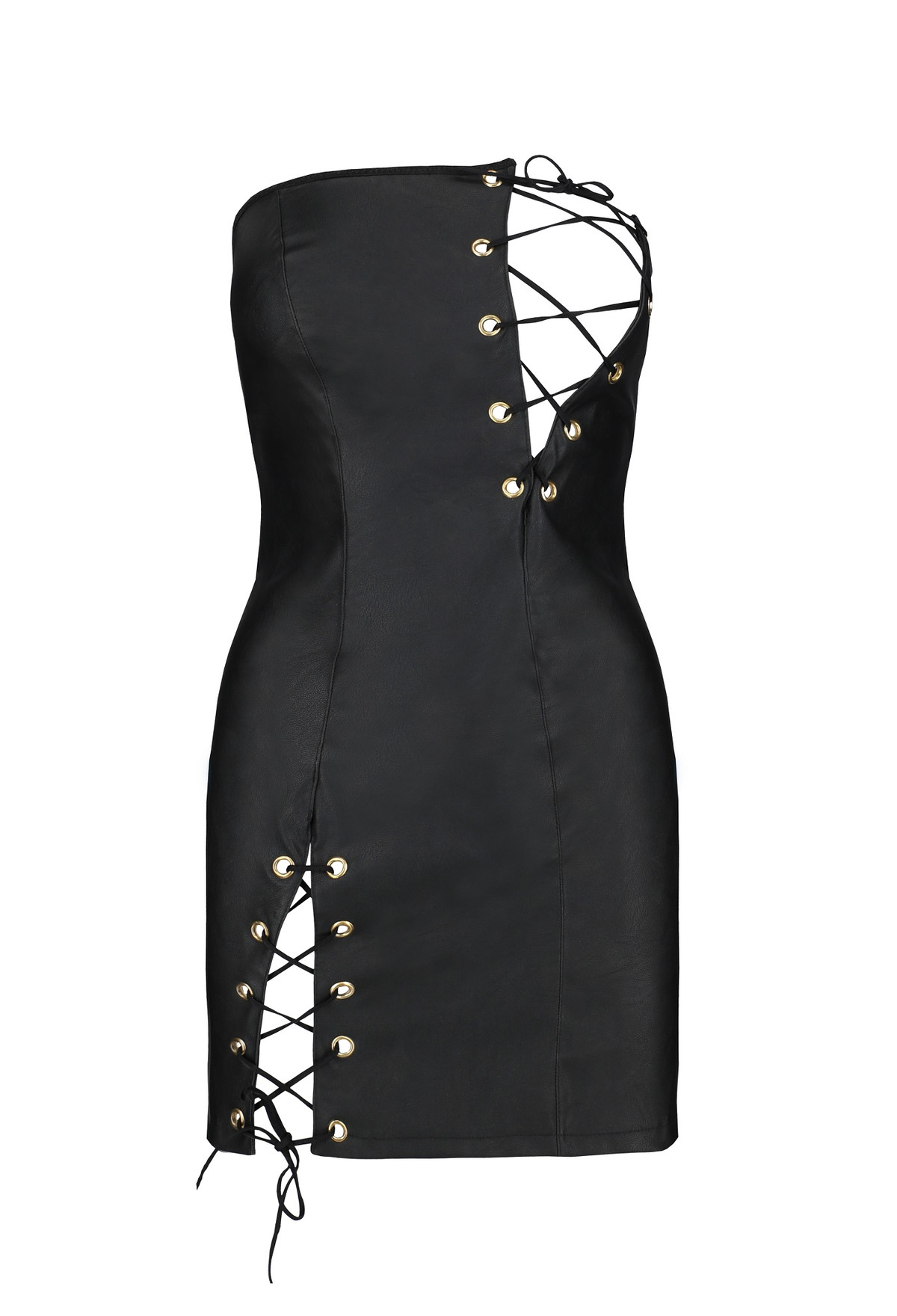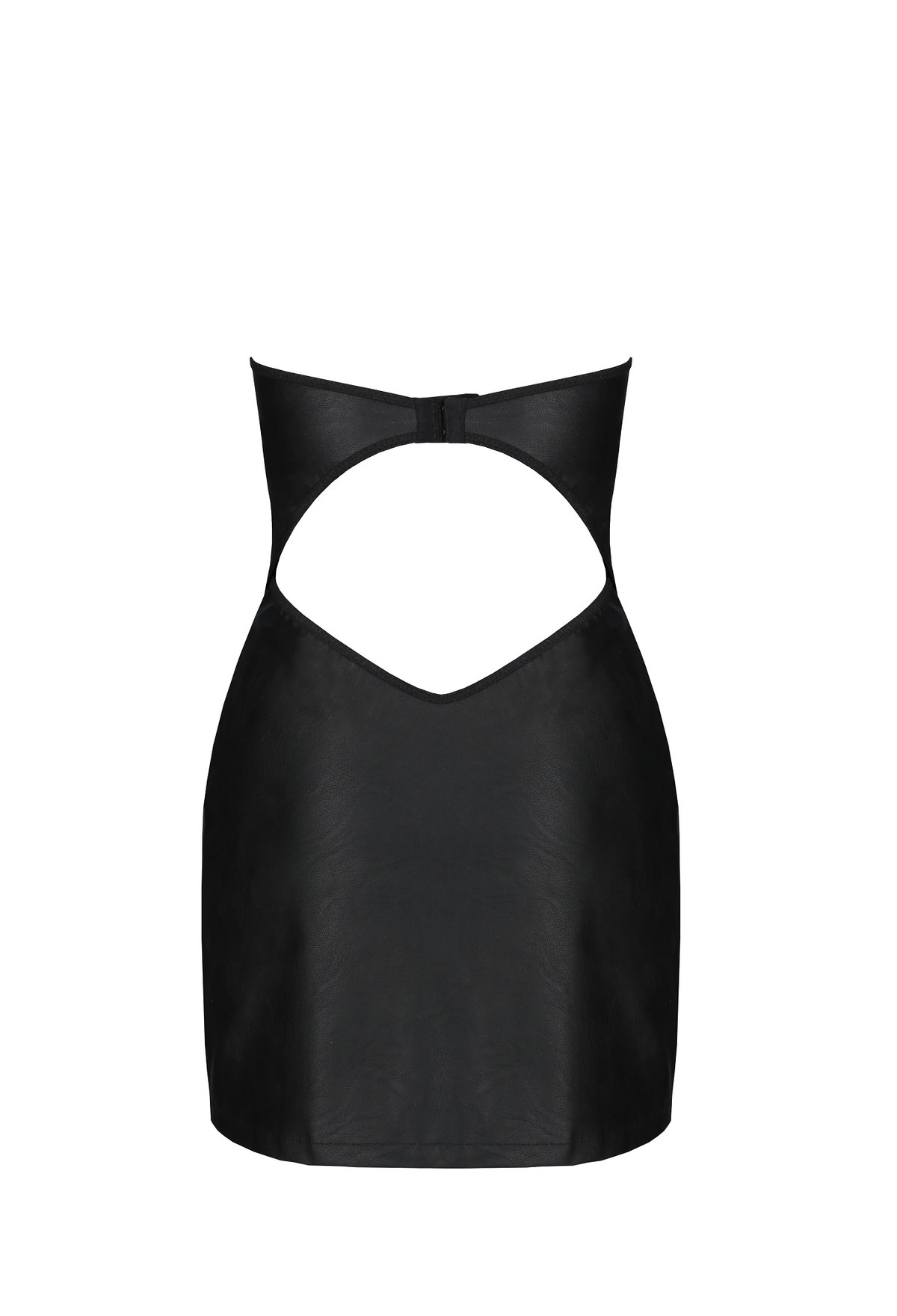 Schwarzes Minikleid in Lederoptik. Hinten mit einem verstellbaren Hakenverschluss. Trägerlos und rückenfrei. Im Set ein passender String.