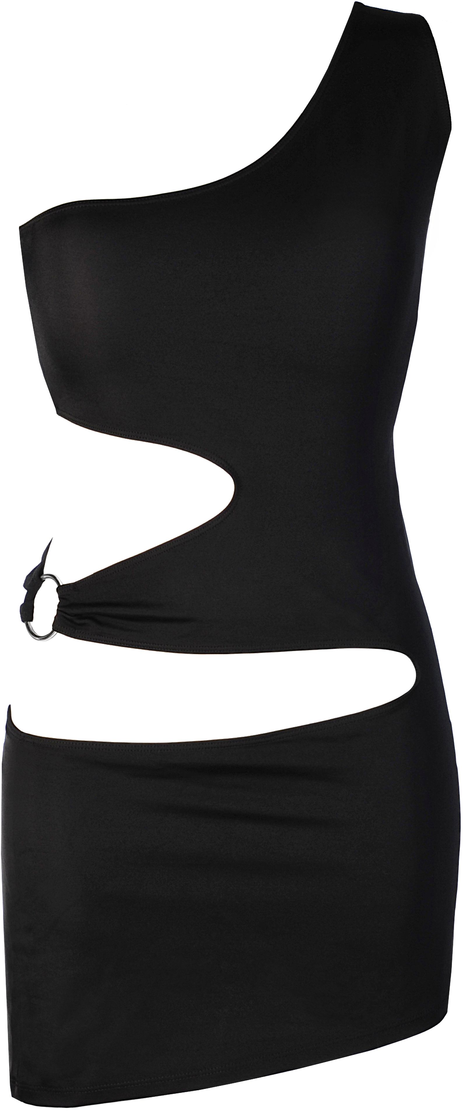 Schwarzes Minikleid aus elastischem Material. Mit einem seitlichen Metallring und sexy Cutouts. Verfügbare Größen: S, M, L, XL