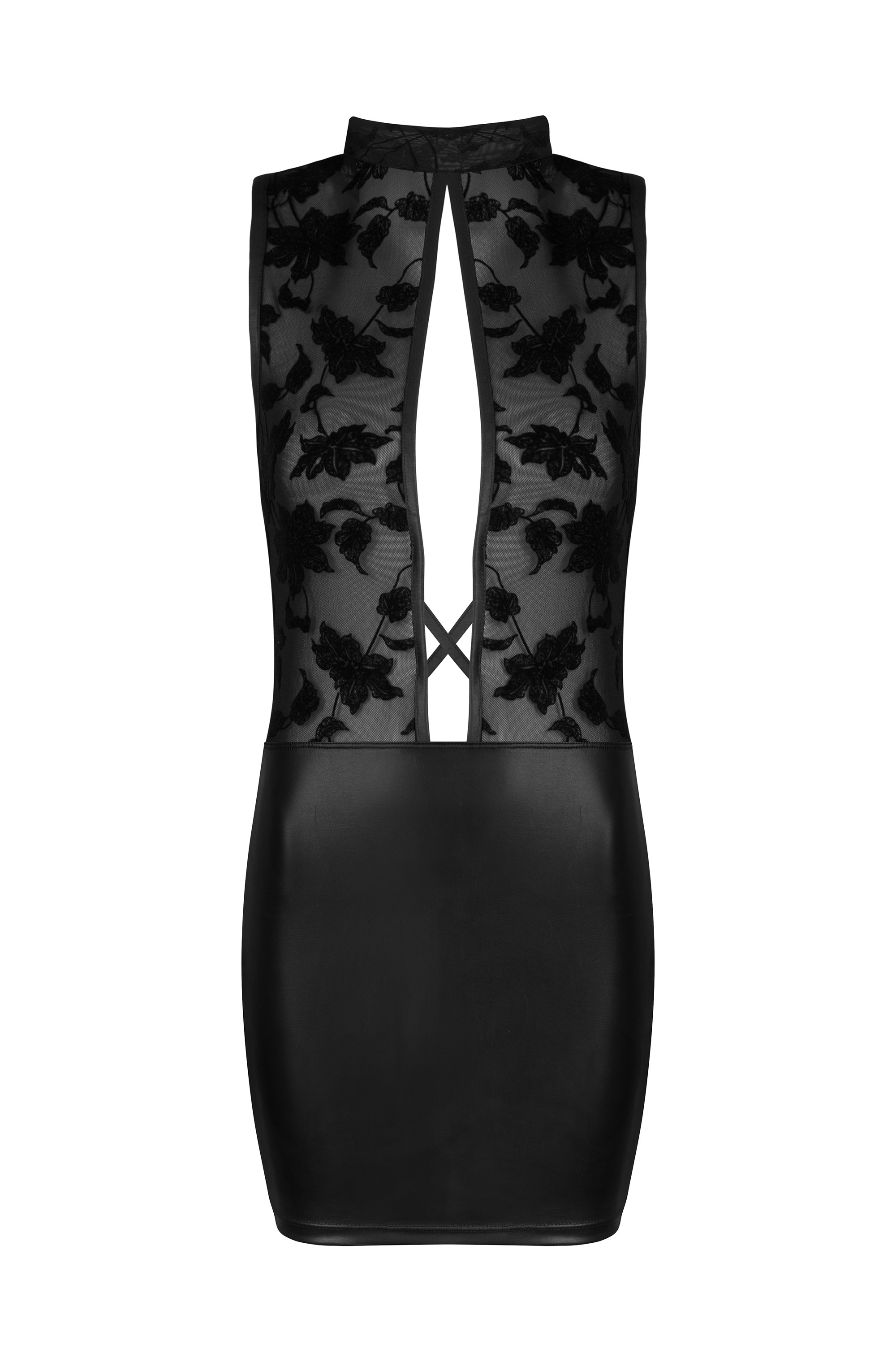Schwarzes Minikleid mit tiefem Ausschnitt vorne und am Rücken. Am Oberkörper aus transparentem Tüll mit Blumenmuster. Der untere Teil ist aus Wetlook-Material.