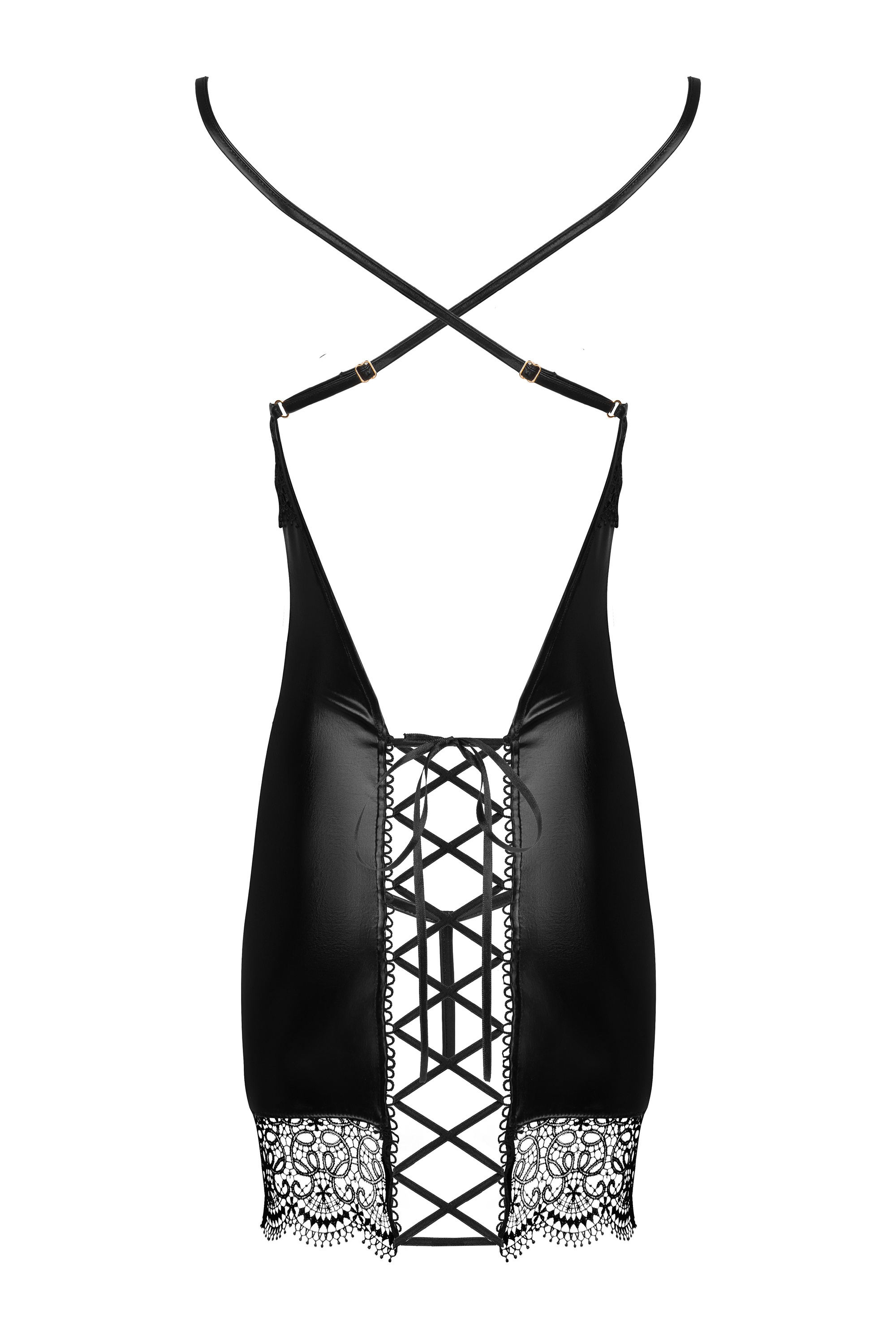Schwarzes Minikleid im Latex-Look mit Bügel-Cups und verstellbaren Trägern. Am Dekollete und am Saum aus transparenter Spitze. Am Gesäß mit einer Schnürung.
