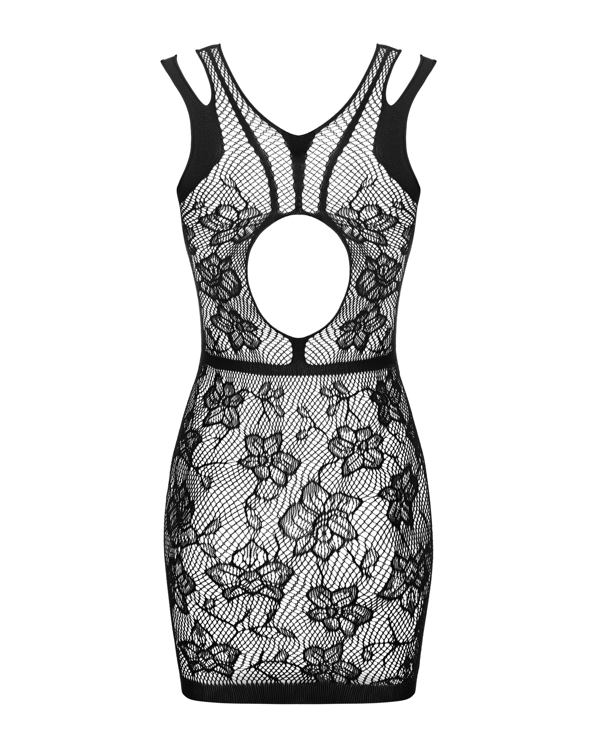 Minikleid aus schwarzem Netz. Elastisch und transparent, mit Ausschnitt am Rücken. mehr