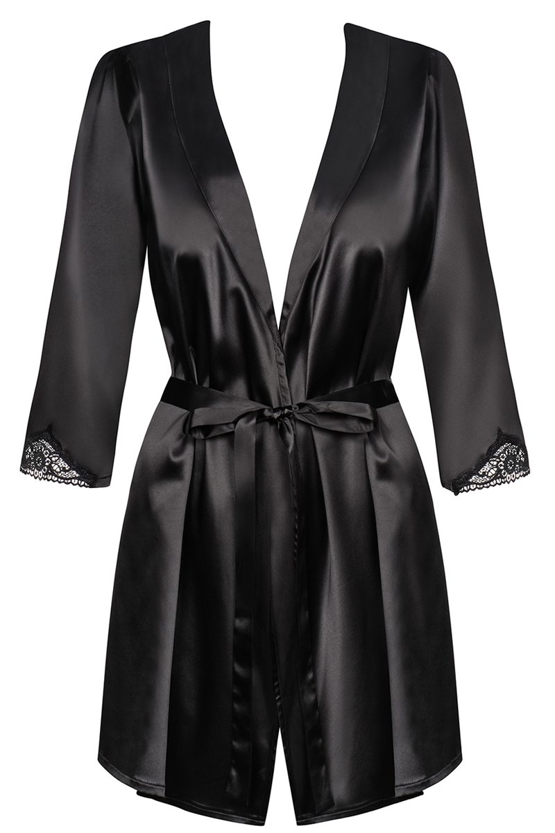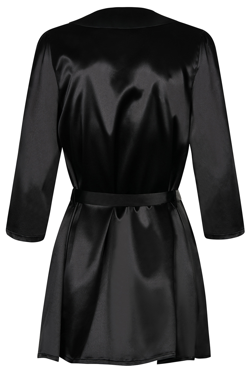 Mäntelchen aus glänzendem Satinmaterial in schönem Schwarz. Sie wird mit einem breiten Satingürtel gebunden. Die 3/4-Ärmel sind mit einem Guipure-Einsatz verziert. Passender String enthalten.